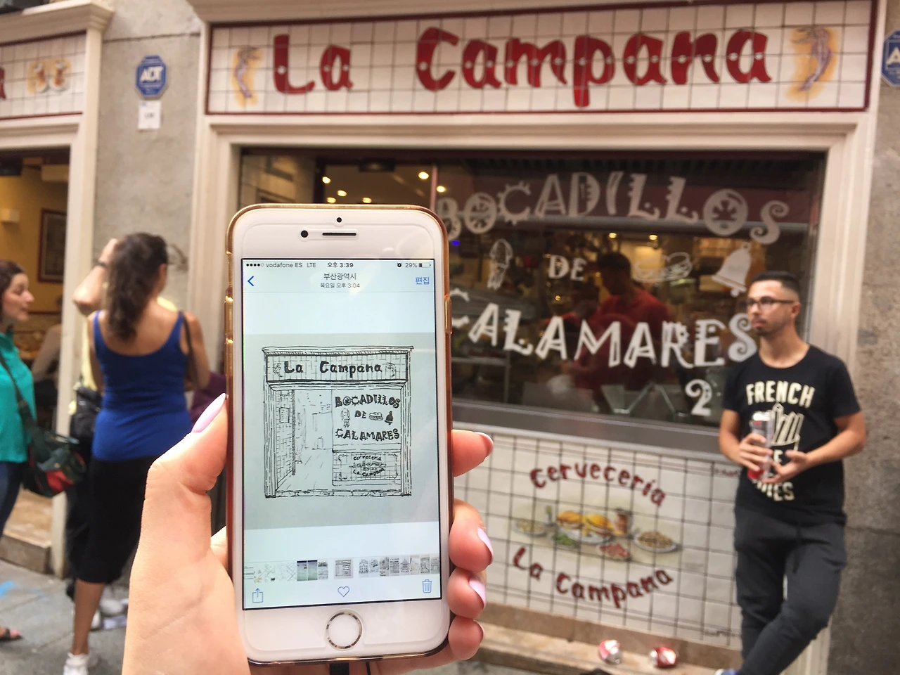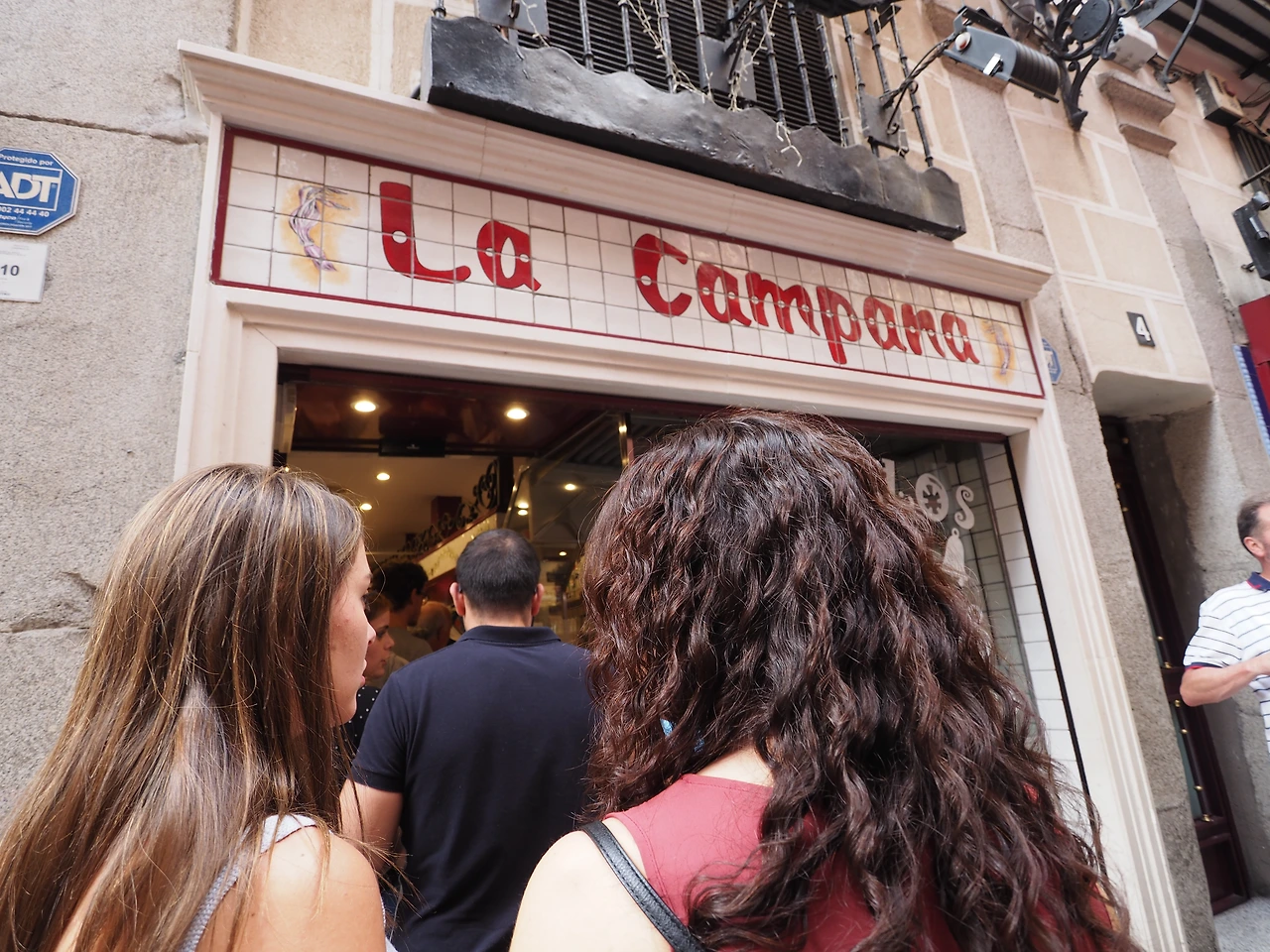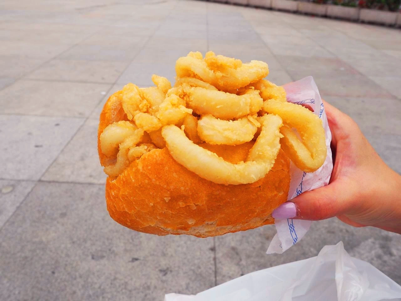 마드리드에서 두 번째로 소개할 음식은, 마드리드 여행자들에게 사랑받는 오징어튀김 샌드위치(Calamares)이다. 마요르 광장에 있는 '라 캄파나'가 유명한데, 명성만큼 줄도 길었다. 줄이 줄어드는 속도는 빨라서 기다릴만한 정도다. 요 샌드위치는 별다른 소스 없이 짭쪼름하게 간이 된 오징어튀김을 듬뿍 넣었는데, 빵은 바게트 빵을 사용한다.