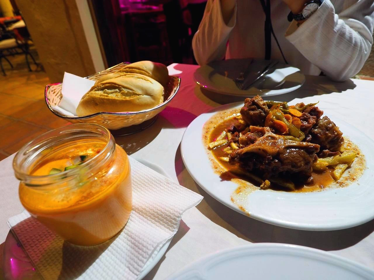 그래서 우리가 찾은 식당은 돈 미겔 호텔의 레스토랑이다. 누에보 다리 뒤편에 위치해있고 테라스 자리가 있어서 선택했다. 소꼬리찜(17.25유로)과 가스파쵸(차가운 토마토 수프, 5.40유로)를 주문. 소꼬리찜은 한국인의 입맛에 잘 맞는 달짝한 소스, 부드러운 고기 정도의 감상. 특별히 기억에 남는 맛은 아니고, 테라스가 있는 레스토랑에서 식사하기엔 합리적인 가격이라고 할 수 있다.