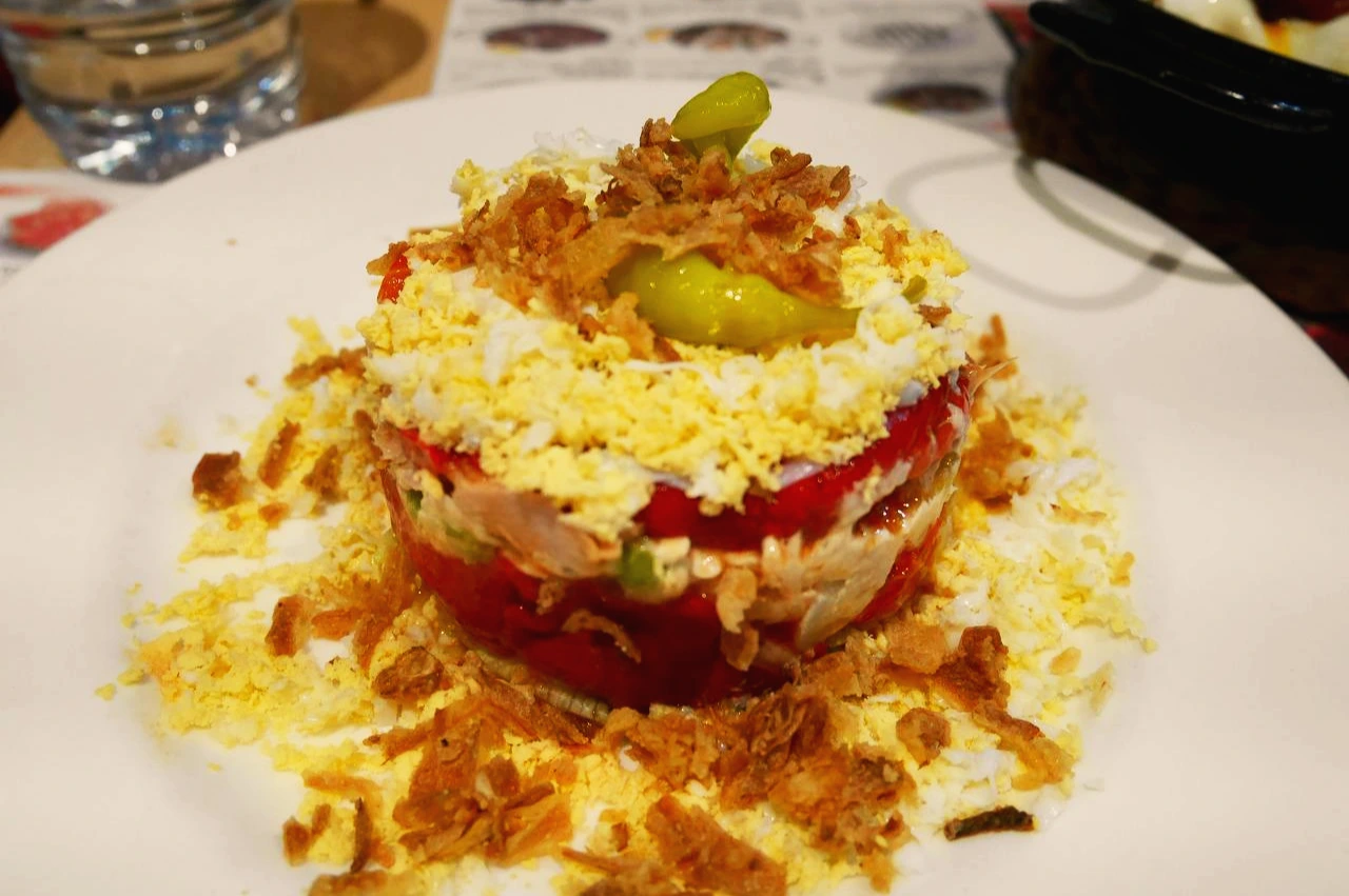 먼저 웨이터가 우리집에서 가장 자신있는 타파스라고 추천해준 피카 피카쏘! 피망샐러드다. 달걀때문에 따뜻할거라 생각했는데, 차가운 샐러드여서 재밌었다. 피망을 오븐에 구워, 껍질을 벗기고 올리브 오일에 마리네이드 한 다음, 마늘, 파슬리, 매운 파프리카 가루, 참치와 삶은 계란을 넣어 만든 샐러드다. 생전 처음 먹어보는 샐러드인데 합격점이었다.