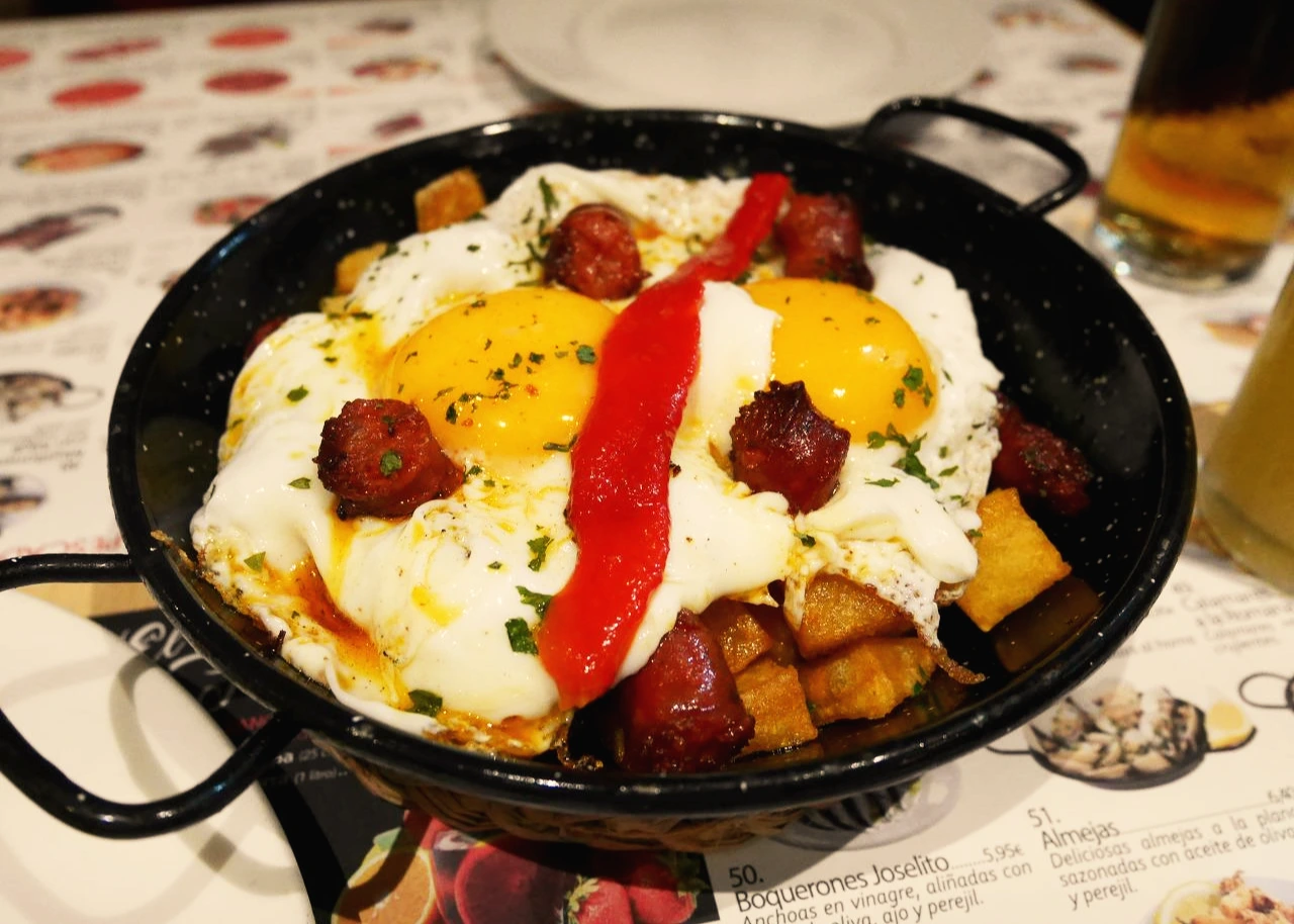 첫번째, '후에보스 까브레아오스'라는 요리다. 얇은 감자튀김 위에 달걀 반숙 2개를 얹어 나오는데, 종업원께서 친절히 비벼준다. 여행 내내 다시 먹고 싶은 타파스 1위였던 이 음식은 다음 시킨 판 콘 토마테와 곁들여 먹으면 말잇못...! 맥주와 잘 어울린다.