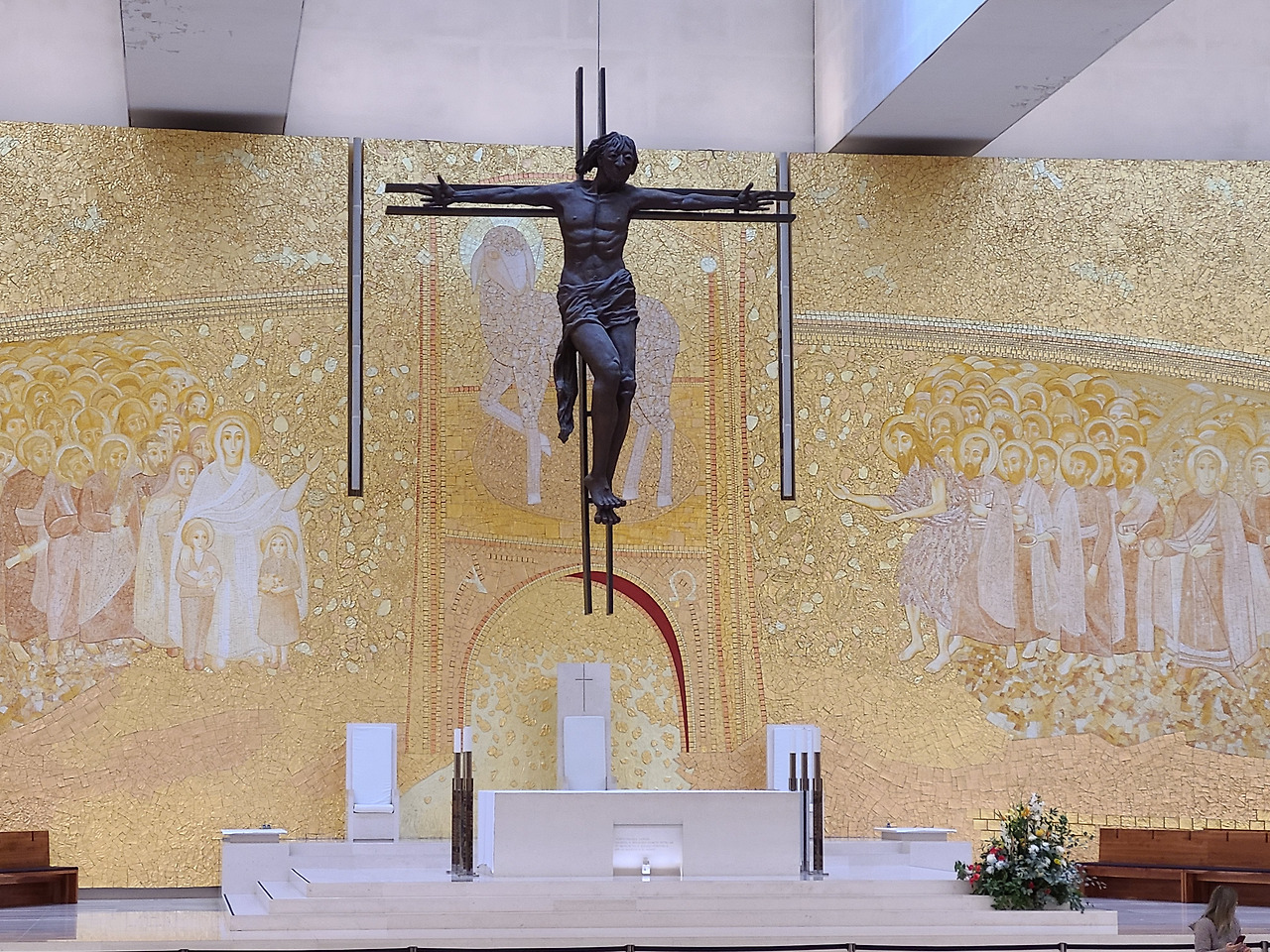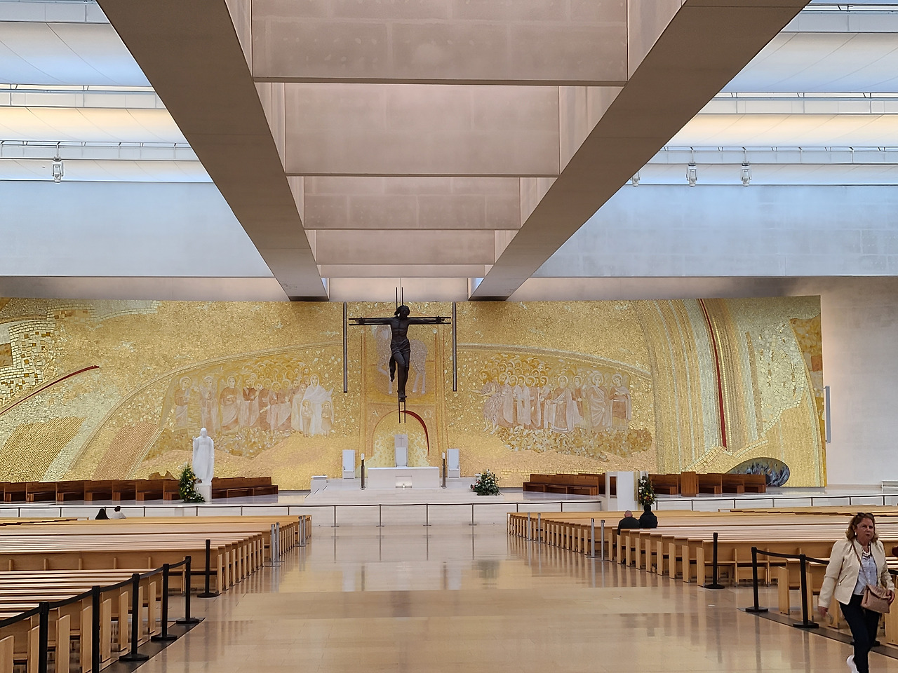 옛 대성당에 들어가니 사람들이 한참 미사를 드리고 있었다. 미사 중이라 뒤에서 조용히 함께하고 있다가 성체를 영하는 시간이 되어 우리도 영성체를 나가서 했다. 그리고 주변을 거닐다가 다시 맞은편에 새로 지은 거대한 성전을 향해 걸어갔는데 입구를 들어가니 어마어마한 규모의 의자가 배치된 대규모의 성당이었다. 얼마나 사람들이 모여들면 이렇게 거대한 성당을 만들게 되었을까 싶었다. 제대 주변은 황금색으로 환하게 빛나고 있었다. 성당 의자에 앉아 묵주기도를 20단 드리고 돌아서서 나오는데 마침 비가 쏟아진다. 그래서 망설이다가 둘러 보니 출입구 유리문에 세계 각국의 언어로 성서 구절이 씌어 있는데 한국어로는 ‘인간이 무엇이기에 이토록 돌보시나이까’라는 구절이 보였다.