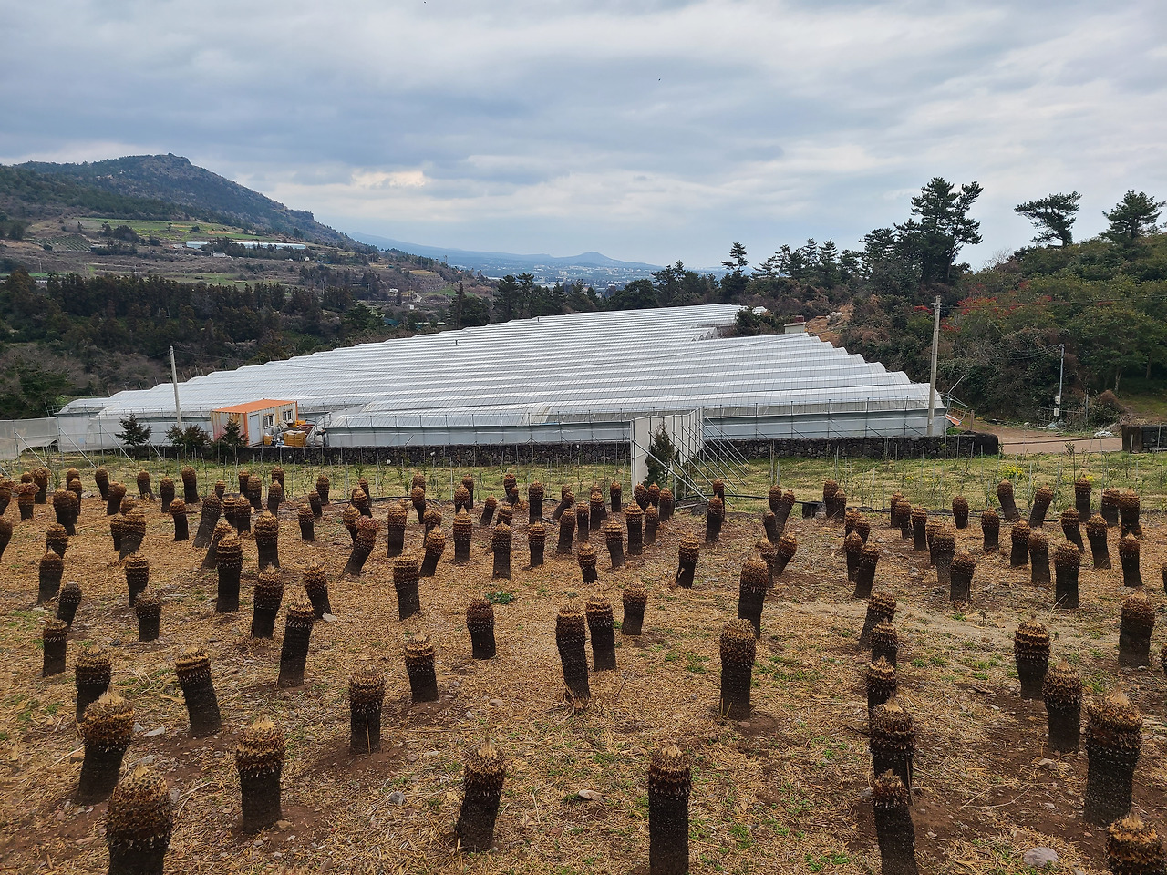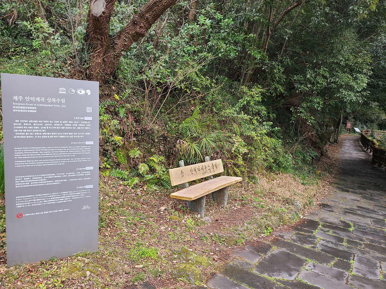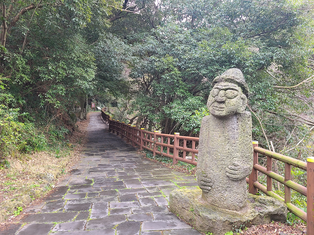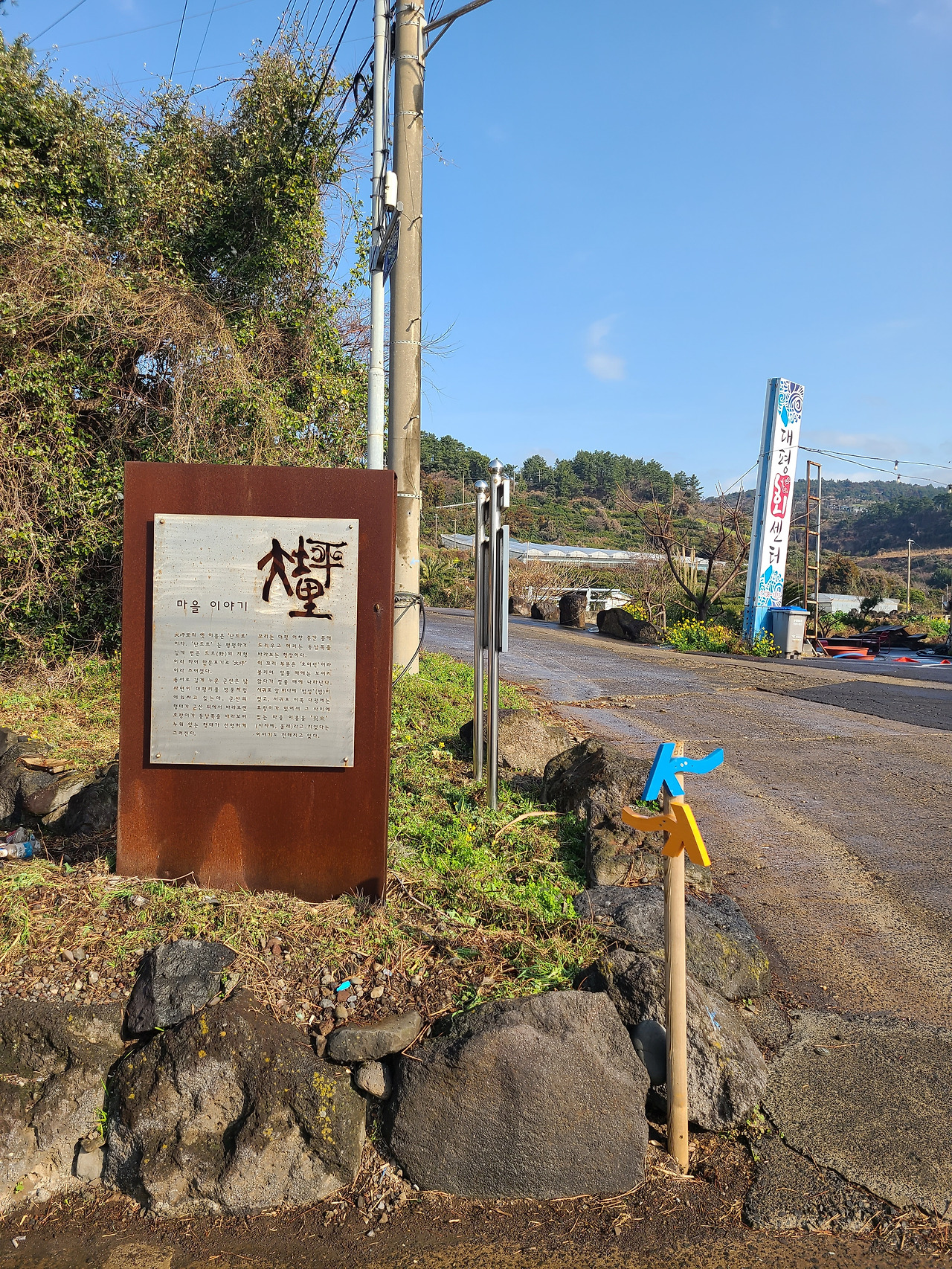 화력발전소를 끼고돌아 안덕계곡을 향해 가다 보면 정자에 올레꾼들이 먹고 쉬면서 갈 수 있도록 정자가 있는데 옥수농원의 주인장이 친절하게도 상품성이 없는 종류가 다양한 감귤을 상자째로 갖다 놓고 까먹으면서 쉬다 가라고 안내문을 써 붙여 놓았다. 그 마음이 참으로 고맙고 따뜻하다. 낯선 사람들이 자꾸 성가시게 굴거나 지나가면 친절하게 대하기가 쉽지 않을 터인데 이런 사람들이 있어서 세상살이의 고단함을 잠시 잊게 한다. 물론 이런 호의를 악용하여 가방에 담아 가거나 지나치게 욕심을 취하는 것은 다음에 지나갈 사람에 대해 배려하지 않는 일이라는 따끔한 언질도 잊지 않는 것을 보면 그런 가능성도 배제할 수 없기 때문일 것이다.