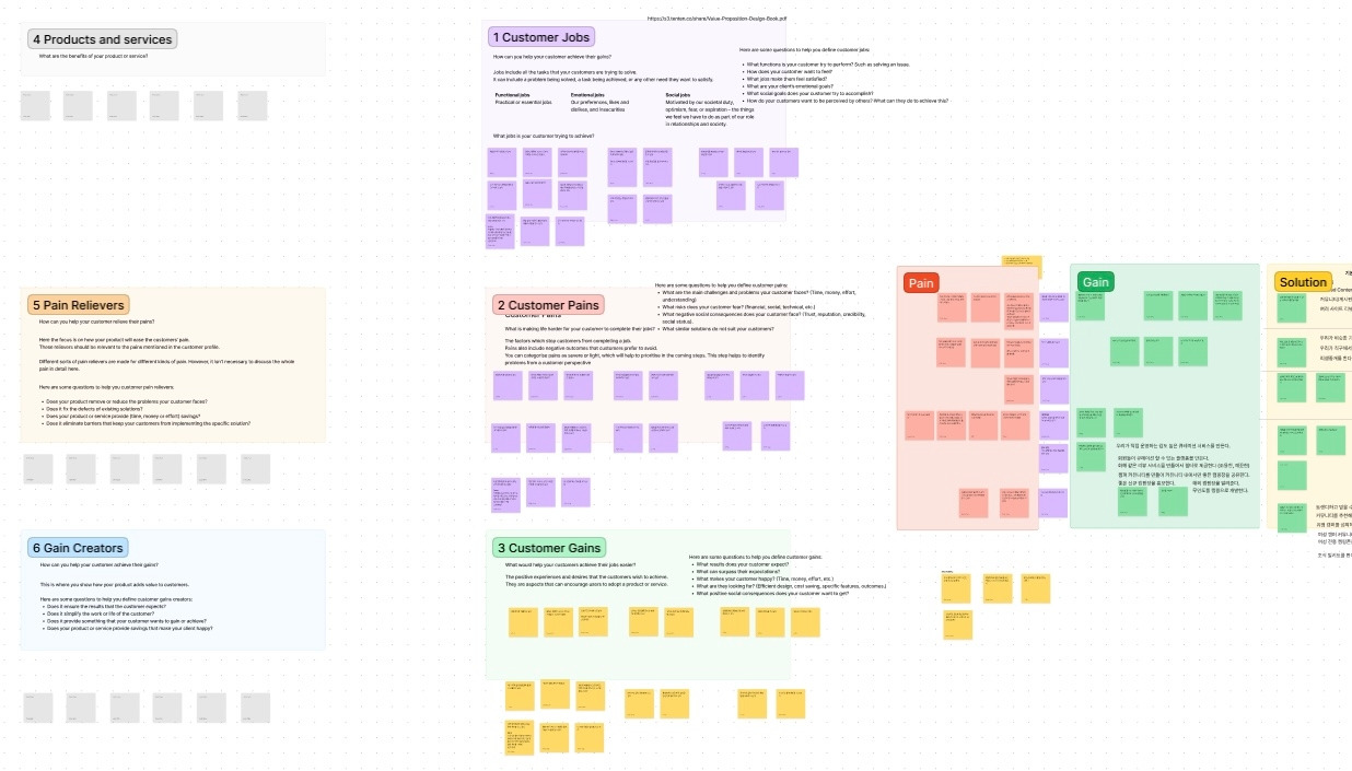 우리는 캠퍼들과의 인터뷰 내용을 기반으로, 가치 제안 캔버스에 포스트잇을 붙이며 생각을 구조화해나갔다. 여러 요소들 중에서도 Customer Job과 Pain에 집중하여 정리하였는데, 정리한 내용은 아래와 같다.