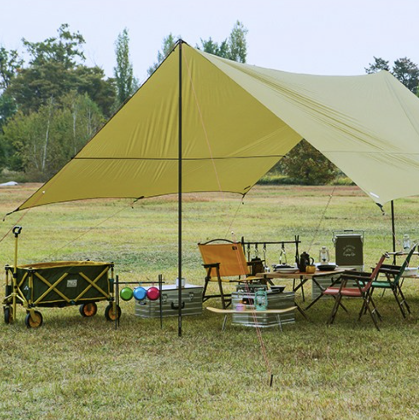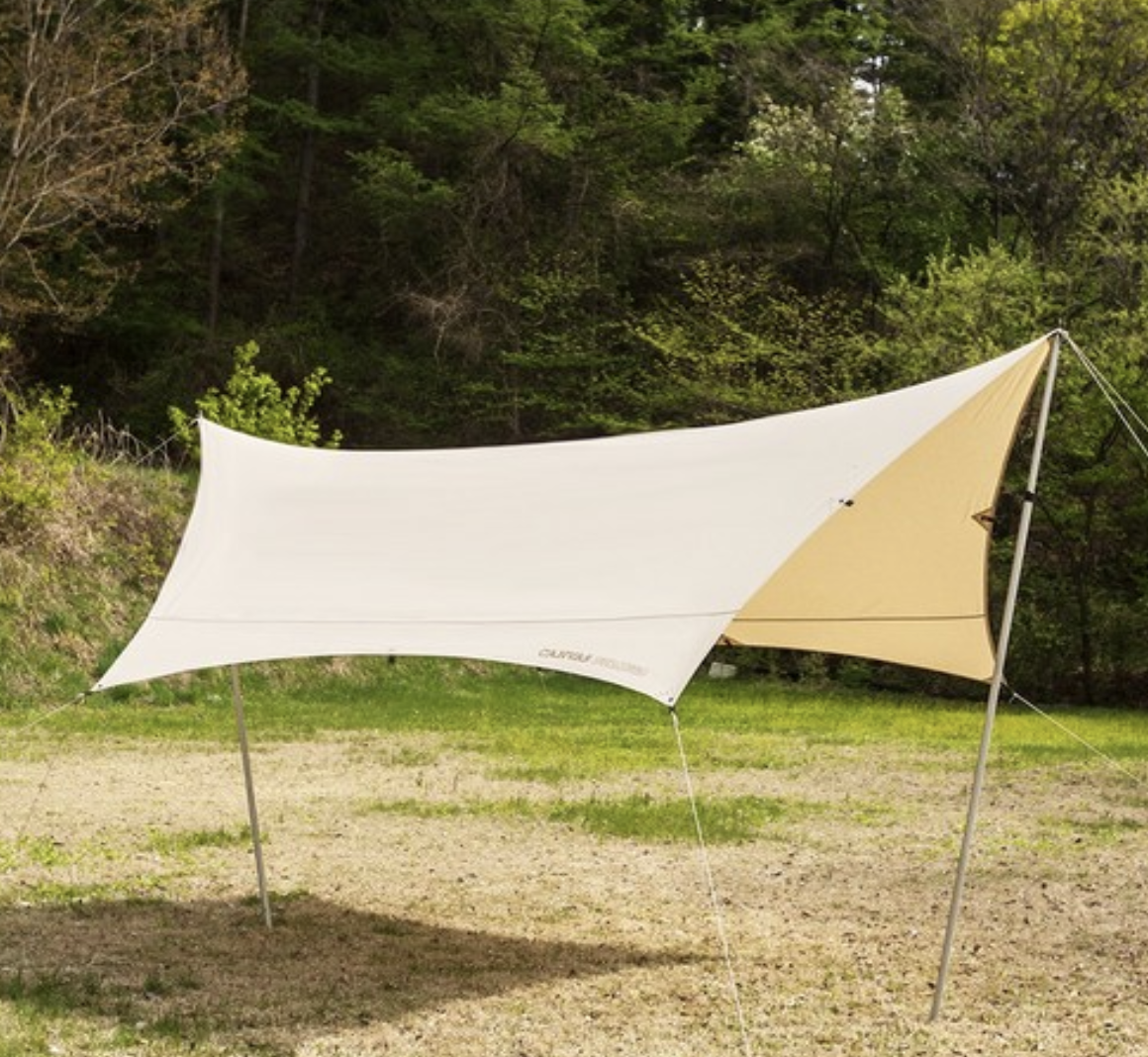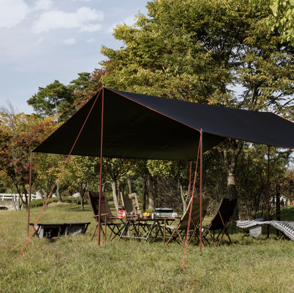 렉타 타프: 사각형으로 그늘이 넓어 패밀리 캠핑과 단체 캠핑에 적합하나, 설치가 복잡하다.