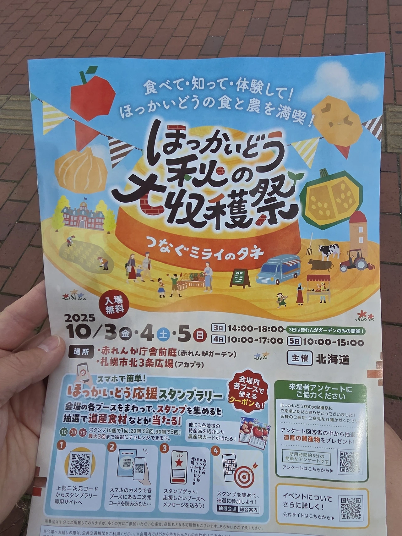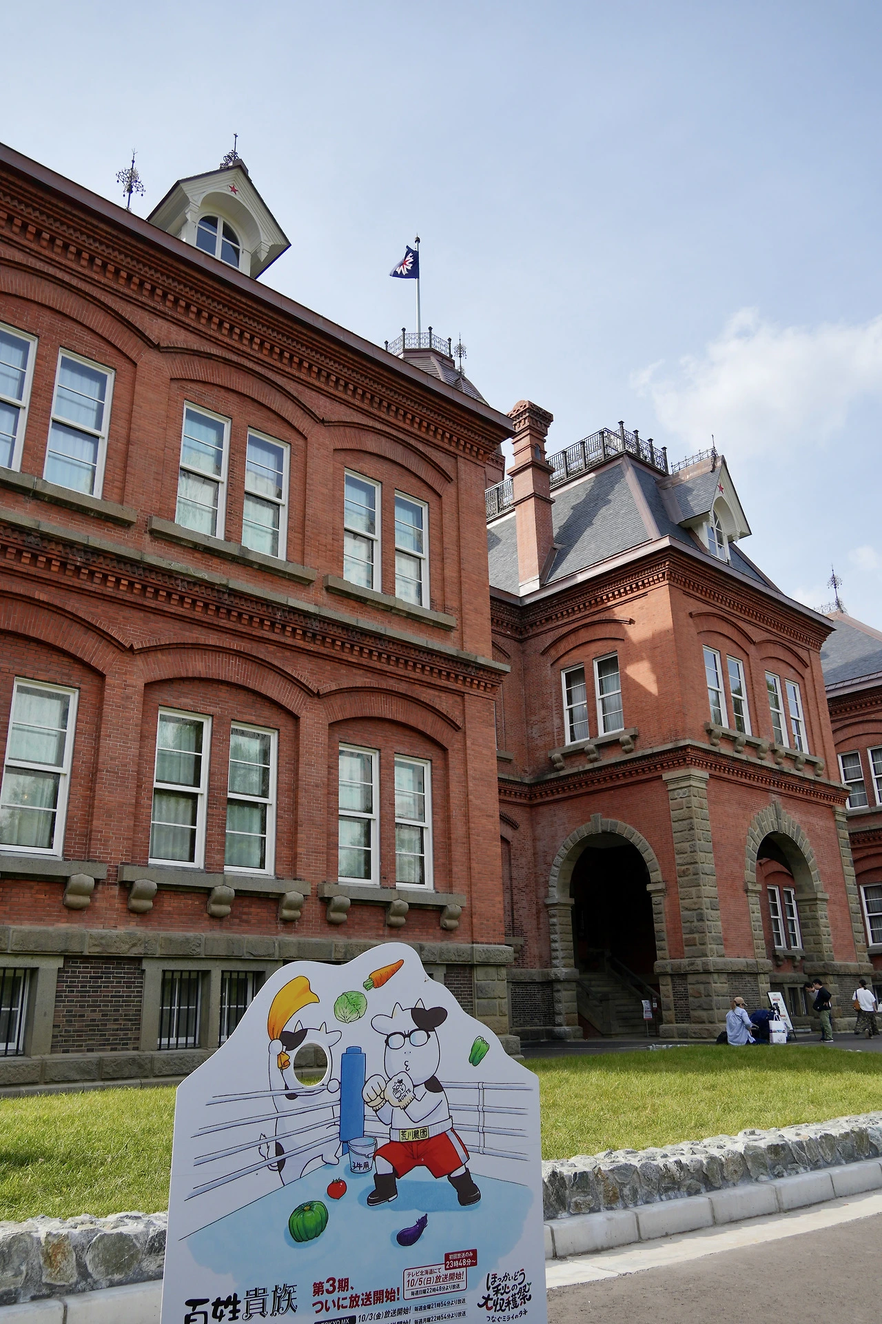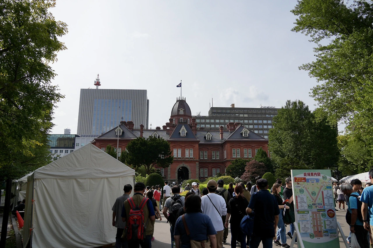 구 홋카이도 도청사 건물은 붉은 벽돌로 외장을 꾸며놓아 '아카렌가'라는 별명이 붙어있는데 (하코다테에도 붉은 벽돌로 만들어진 예전 수산물 도매창고 건물들이 있는데, 거기도 카네모리 아카렌가), 아카렌가 광장과 정문 앞에서 북 3가로 이어지는 길목인 아카프라 (아카렌가 테라스 앞 플라자)에서는 종종 여러 행사가 열리고 있었다. 이날은 한국과 중국의 추석연휴라는 걸 의식했는지, '홋카이도 가을 대수확제'라는 이름으로 나름의 농산물 직거래 시장 같은 걸 열고 있었다. 부스마다 주로 각 지역 농산물들, 혹은 2차 가공품들을 가지고 나와 판매를 하고 있었는데, 개중에는 승마 체험 (아이들을 위한 목마)이나 착유 체험 (이 역시 아이들을 위한 놀이기구로 모형 소에 젖병을 달고 있었다) 등이 가장 인기 있어 보였다. 그리고 이번 여행에서 나를 홋카이도로 이끈 작품 중 하나인 '아라카와 히로무'의 <백성귀족> TV 애니메이션 새 시즌 방영에 대한 광고도 많았다. 전날 토요일에는 사인회도 했었던 모양.