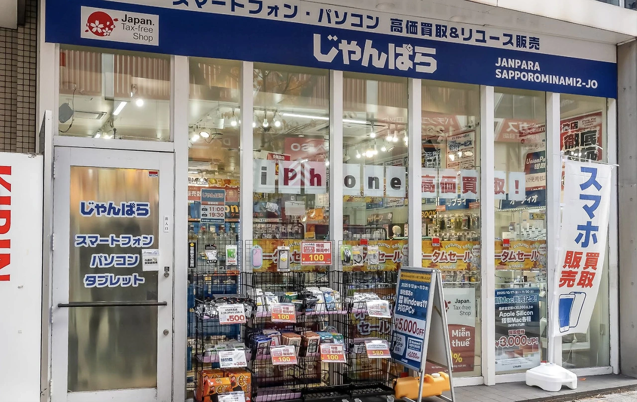 재수 좋게 2층 창가 근처에 난 자리를 냉큼 잡아 거리를 내려다보며 먹고 있는데, 오.. 여행 출발 전에 삿포로 중고전자제품을 검색하다가 봤던 이름이 보인다. '잔파라 じゃんぱら'. 오. 나, 나 저기 아는데. 입구 옆 작은 현수막에는 "스마호 スマホ"라고 가타카나로 쓰여있다. 일본에서 스마트폰을 부르는 말이다. 오케이. 함 가봐야겠다. 크게 기대는 안 하겠지만.