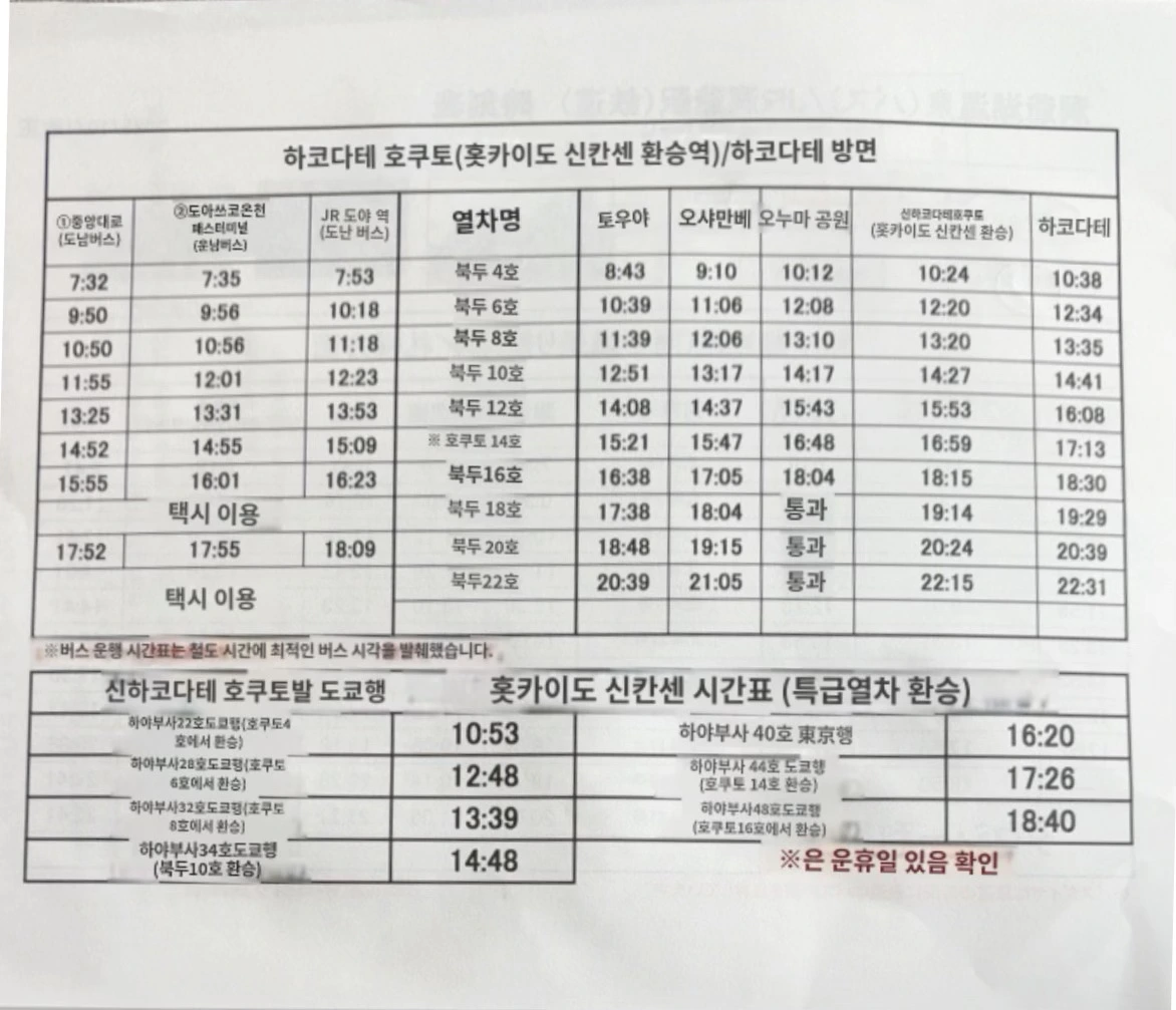 5. 11시 55분 버스를 타서 JR 도야 역에 내리면 하코다테까지 가는 열차를 탈 수 있다고 확인해주고 나서는