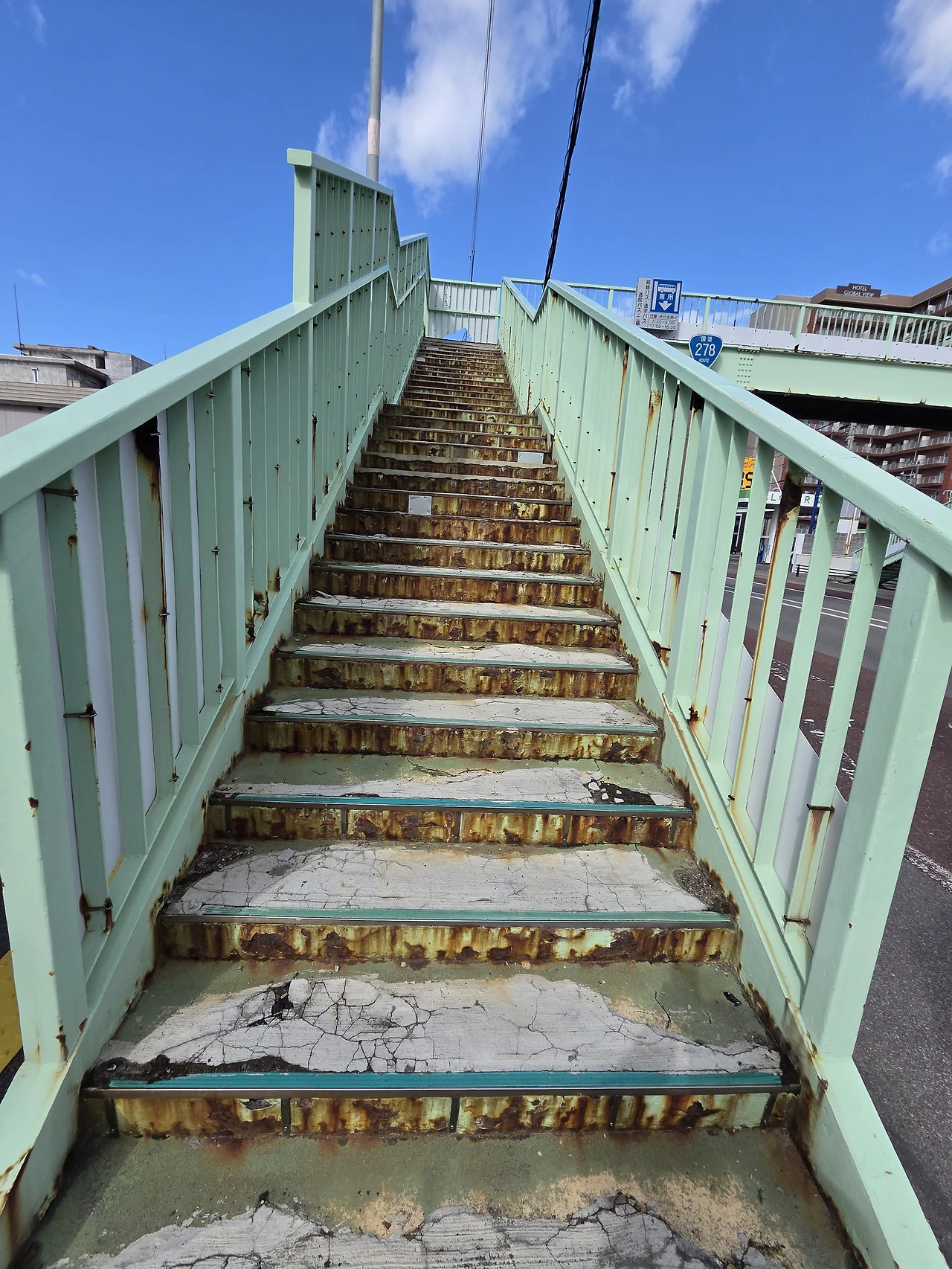 시내를 가로질러 반대편 해안으로 하는데 시간이 제법 걸린다. 이러다간 오늘도 2만 보 가볍게 넘을 판. 상업지구에서는 끝없이 흘러나오던 마을 방송들도 거주지로 들어가니 좀 잠잠해진다. 그런데, 바닷가에 가까운 거주지로 갈수록 그동안 생각해 온 일본이라고 믿기지 않을 정도로 쇠락해 있다. 금방이라도 무너져 버릴 것 같은 집들, 육교의 계단도 마치 정비를 안 한지 몇십 년은 되어 보인다. 그러고 보니 근처 상업지구를 통과해 오는 동안에도 굳게 셔터가 내려간 건물들이 많이 보였다. 이게 말로만 듣던 일본 지방 소도시의 현실인가? 반대쪽 해안 마을, 역과 항구 주변의 화려한 호텔과 식당들에서 일한 사람들도 퇴근하고 나면 이런 집으로 돌아오는 건가? 엔화 환율이 낮아서 여행 가성비가 좋다고만 생각했었는데, 일본의 경제불황은 겉으로 보이지 않는 곳부터 곪고 있었던 걸까?