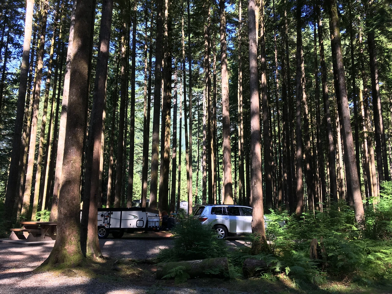 이렇게 사이트가 많은 캠핑장임에도 불구하고 개별 사이트 크기가 크고, 사이트 간 간격이 널찍널찍해서 비교적 프라이버시 보호가 좋다는 점도 장점이라고 할 수 있겠다 (그리고 그 간격이 나무들로 차 있어서 옆 사이트 소음이 거의 들리지 않는다). 특히 '골드크릭 캠핑장'의 캠핑장 주변 둘레길 'Trillium Drive'에 배치된 TD 사이트들의 경우, 뒤쪽 산 길이나 계곡길과도 연결이 되어있어서 사이트 크기도 무척이나 여유롭다. 또 ('롤리 호수 캠핑장'과 달리) 모닥불 화로도 캠프 사이트 안쪽 깊숙이 배치되어 있어서 프라이버시를 만끽하면서 불멍을 즐길 수 있다.