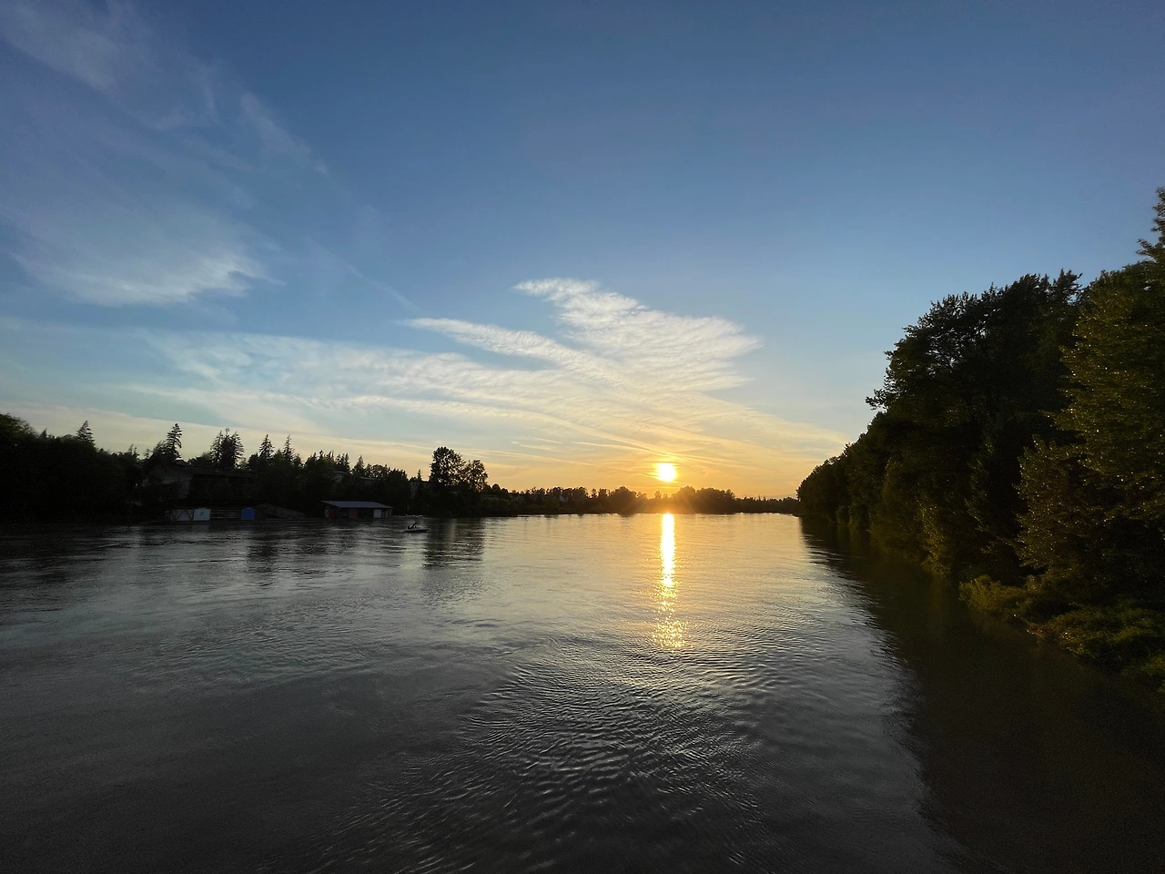 시내로 슬슬 걸어 나가고 있으려니 프레이저 강 너머로 해가 지고 있다. 그러고 보니 수위가 많이 올랐다. 지난 2017년에 왔을 때엔 이건 뭐 강이라기보다는 무슨 뻘이나 늪이라고 해야 하는 거 아닌가 싶었는데, 올해는 일찍 시작된 더위 덕택에 BC 북쪽에서 눈이 일찍 녹았다고 한다. 이후에 산책로를 다니다가 보니까 실제 여러 산책로가 물에 잠겼다고 하면서 폐쇄되어 있었다. 이렇게 한 때 너무나 당연하다고 생각했던 것들이 사라지는 기후 변화이지만, 이날만큼은 뿌연 프레이저 강을 비추는 저녁놀을 아무 생각 없이 즐기고 싶었다.
