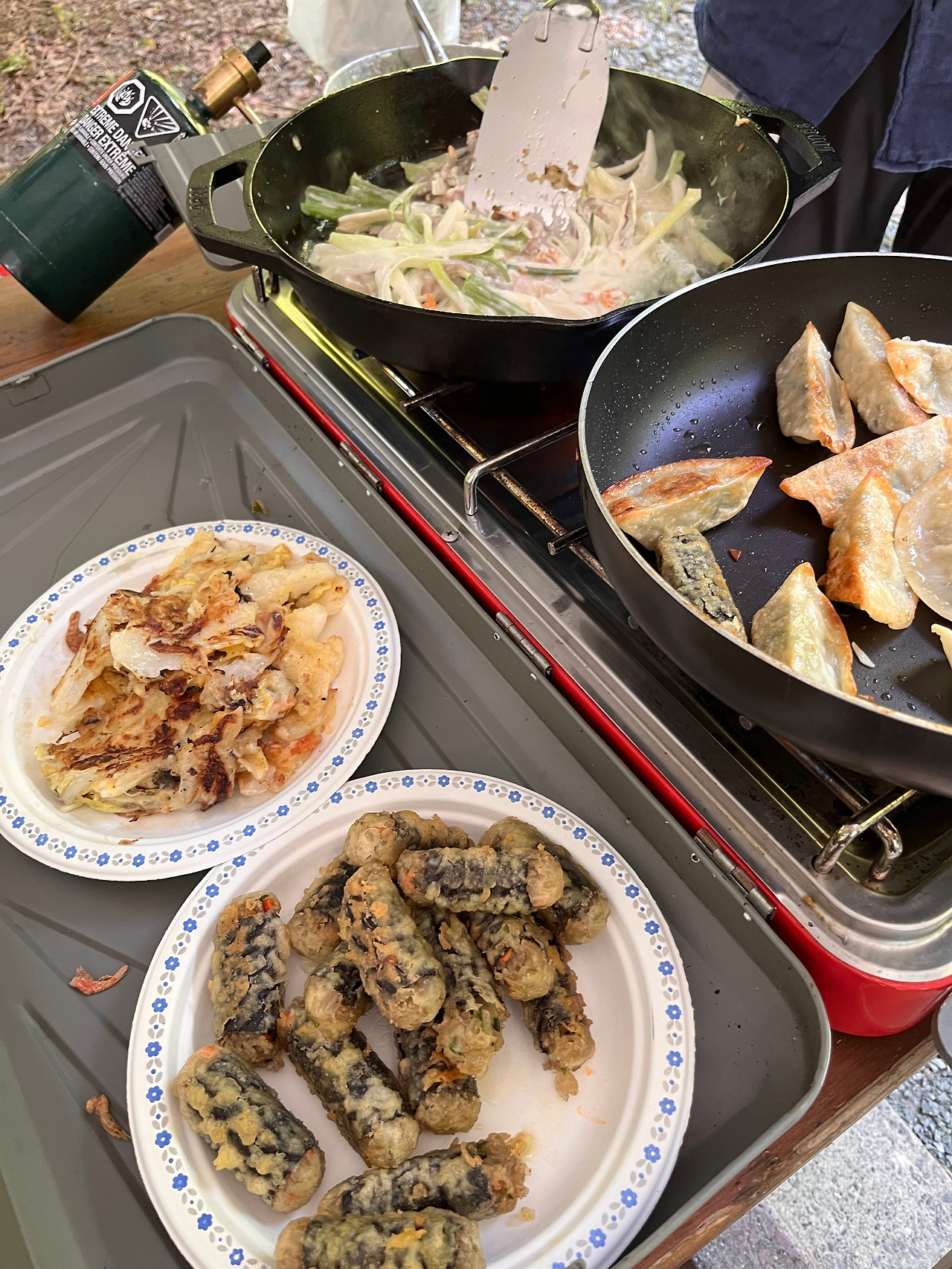 아니나 다를까, 여전히 시끄럽다. 어쩐 일인지 모터보트는 그리 많지 않지만, 캠핑장 뒤쪽 차도에서 분노의 질주가 이어지는 건 여전하다. 가뜩이나 캠핑장들로 향하는 길이라서 트럭들이 많은데 약간의 경사 때문에 엔진 토크 소리가 우렁차다. 모닥불을 피워놓고 유튜브에 올리기 위해 장시간 롱테이크 촬영을 했는데 현장음을 거의 하나도 건지지 못했다. 나중에 편집할 때 6개 레이어로 촘촘히 효과음을 깔아 넣어야 했다. 하지만 이번에는 우리도 둘만의 고요한 캠핑을 계획한 건 아니었다. 고맙게도 지인들이 찾아주셨고, 토요일 오전부터 맥주를 까면서 왁자지껄 정신없이 즐거운 시간을 보냈다. 이날의 메뉴는 전통 파티음식인 부침개와 떡볶이. 기름 냄새가 많이 나서 집에서는 엄두가 나지 않는 음식들을 맘껏 해 먹을 수 있다는 것도 캠핑의 장점.