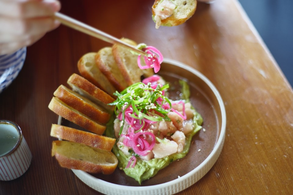 잠도 제대로 못 자고 새벽부터 반바지 차림으로 설쳐댔더니 여전히 몸이 으슬으슬 춥고 머리가 아파왔다. 자연스럽게 뜨끈한 국물이 땡긴다. 그래서 오늘 식당은 라면을 주종목으로 하는 일식당 '쿠마 (Kuma)'. 토피노 시내 다른 관광지 식당들에 비해 가격도 착하고 나름 정통 일식의 맛을 볼 수 있어서 동네 젊은 주민들에게 인기가 있다고 들었는데, 재수 좋게도 대기줄 서지 않고도 쉽게 갈 수 있었다. 4시까지는 "해피아워 (Happy Hour 보통 오후 3시에서 6시까지, 그리고 밤 10시 이후 시간으로 레스토랑이나 바에서는 비교적 한가한 시간이기 때문에 음료나 간단한 스낵을 좋은 가격에 제공한다. 미국 도심지에서는 오래전부터 일반적이었던 것 같은데, 밴쿠버에선 2010년 이후에 도입되기 시작되었다)" 라면서 라면을 포함한 저녁 메뉴는 4시 이후에나 주문받을 수 있단다. 어쨌건 먼저 뜨끈하게 데운 사케를 해피아워 가격으로 먹을 수 있다는 것도 장점 (2022년 6월에 다시 방문했을 때엔 쿠마 식당이 폐점하고 그 자리에 퓨전한식 레스토랑인 제주 (Jeju)가 개업한 걸 발견했다. 이곳에서 시식해 볼 기회는 없었지만 BTS 음악이 계속 흘러나오고 있었다). 계속 추위에 떨며 웅크리고 있었는데 뜨거운 술이 들어가니 오장육부가 확 느슨해지는 걸 느낀다. 치킨 카라아게 역시 달콤한 유자향이 있는 소금으로 간을 해서 상당히 맛이 있었다. 행복한 표정으로 음식을 즐기고 있자니 금방 저녁 시간이 되었고 곧이어 관서풍의 오코노미야키와 샬롯 피클을 곁들인 로컬 참치 타르타르가 나왔다. 오코노미야키의 경우 (어쩌면 당연하게도) 직접 구워 먹을 수 있는 시스템이 아니어서 아쉬웠지만, 거의 깍둑 썰기한 양배추와 함께 시카고 피자처럼 두툼하게 나와서 아주 신선한 경험이었다. 여기에 참치 타르타르까지 바게트에 얹어 꾸역꾸역 먹다 보니 애 목표였던 라면을 먹을 공간이 남아있지 않았다. 아.. 비 오고 으슬으슬한 날엔 뜨끈한 라면 국물이 딱인데..