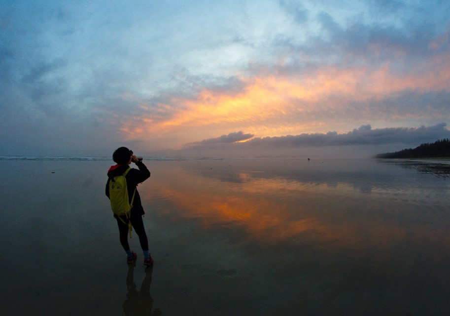 하늘은 아직 잔뜩 찌푸려 있어서 "노을을 보긴 어렵겠지만, 뭐 그래도 한번... "이란 식으로 해변에 내려가 보았는데... 오오오... 오히려 이렇게 구름 낀 하늘이 갯벌에 반사되는 풍경이 굉장히 근사했다. 사진으로만 보던 유우니 소금 호수가 이런 모습 아니었던가.. 여기에 꽉 찬 구름 틈 사이에 붉은 노을빛이 삐죽 나오자 갯벌도 덩달아 붉게 물들기 시작했다. "아하하. 역시 캐나다 바다를 무시하는 게 아니었어. 멕시코, 카리브해가 다 무어람. 우린 정말 아름다운 곳에서 살고 있는 거였어.." 이런 자뻑에 잠긴 채로 해변을 서성이며 날이 어둑해질 때까지 있었다.