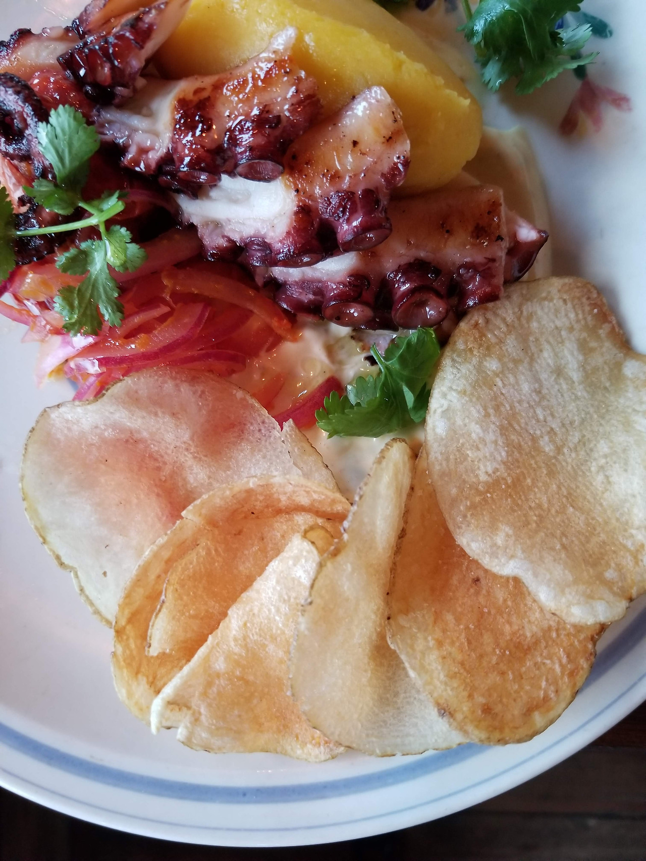 밤새토록 화장실로 출퇴근을 반복했더니 굳이 오늘 아침엔 화장실 때문에 일어나지 않아도 되는구나. 배탈의 순기능이네. 대충 정리하고 아침에 커피를 만들어서 마시다 보니 아내가 오늘 아침에는 '울프인더포그 (Wolf In The Fog)'에 가보자고 한다. ‘토피노 가 볼 곳’ 혹은 '10 things you must do in Tofino'라고 구글 검색을 해보면 반드시 순위권에 오르는 토피노 다운타운에 위치한 레스토랑인데, 방대한 칵테일 셀렉션으로 유명하다고 한다. 아침부터 저녁 늦게까지 영업을 하는데 식당이라기보다는 바 같은 느낌. 그래서인지 브런치 영업을 할 때에는 전망 좋은 2충 테라스는 닫아놓고, 바가 있는 1층 테이블에만 손님을 받았다. 일하는 사람들 입장에선 그게 훨씬 편할지는 몰라도 여유로운 2층이 뻔히 비어 있는데도 따닥따닥 붙어 있는 1층 테이블에 몰아넣어지는 건 그다지 즐거운 경험은 아니었다. 이 집 브런치 메뉴는 뭐.. 컨티넨털 브렉퍼스트나 프렌치토스트 등 꽤나 흔한 아침 식사 메뉴여서 유지방에 탈이 난 뱃속을 달래기 힘들 것 같아서, 그나마 그중에서 하나 특이해 보이는 요리 – 한치 튀김과 페퍼민트 차를 주문하고, 아내는 해산물 차우더와 빵을 주문했다. 차우더는 도무지 맛볼 엄두가 나지 않아서 그쪽으로는 쳐다보지도 않았는데, 아내의 첫인상은.. "(복화술 하듯이 입은 안 움직인 채) 소보 (Sobo)가 훨씬 낫다."