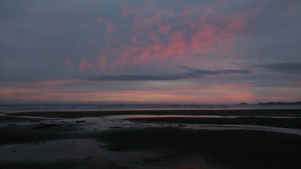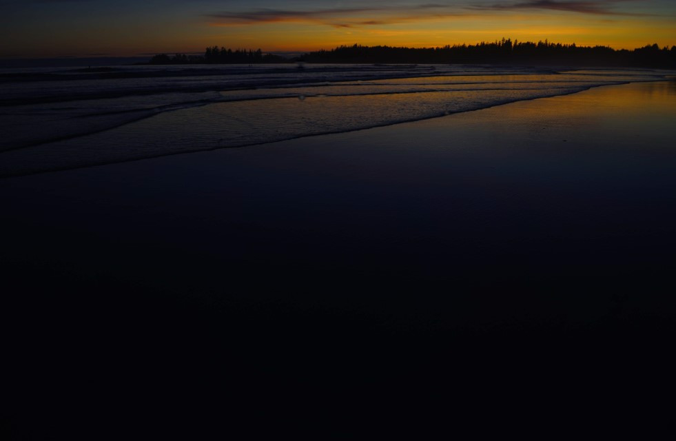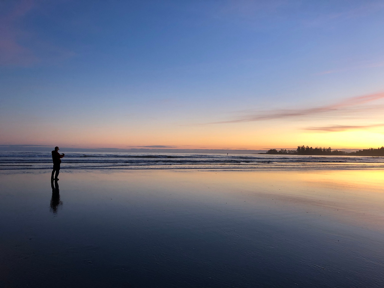 정신없이 먹다 보니 이미 해가 질 때가 다되었다. 동네 사람들이 입을 모아 (오늘은 날이 좋아서) 오늘 석양이 기가 막힐 거라고 했는데 (그만큼 이 동네에선 맑은 날을 보기 힘든 모양이다. 우리가 왔던 지난 2번의 토피노 여행도 별로 그렇게 날씨가 좋은 날이 없었다), 시간상 우리 캠핑장으로 가서 저녁놀을 즐기긴 어려울 것 같았다. 서둘러 캠핑장으로 향하다가 일단 롱비치 해변 주차장에 차를 대어 저물어 가는 노을이 비치는 바다를 구경했다. 아... 아름답다… 주변 지형을 보니, 이 고장 화가들이 수없이 그려온 그림에 나오는, 딱 그 노을이구나. 그 숲에 그 바다고. 저런 장면을, 이 감동을 카메라로 재현해 내는 건 거의 불가능에 가까운 일이겠지만.. 그래도 어떻게든 발악해 본다. 정말... 미칠 것 같은 하늘이라는 표현이, 딱 이걸 보고 하는 말이구나.