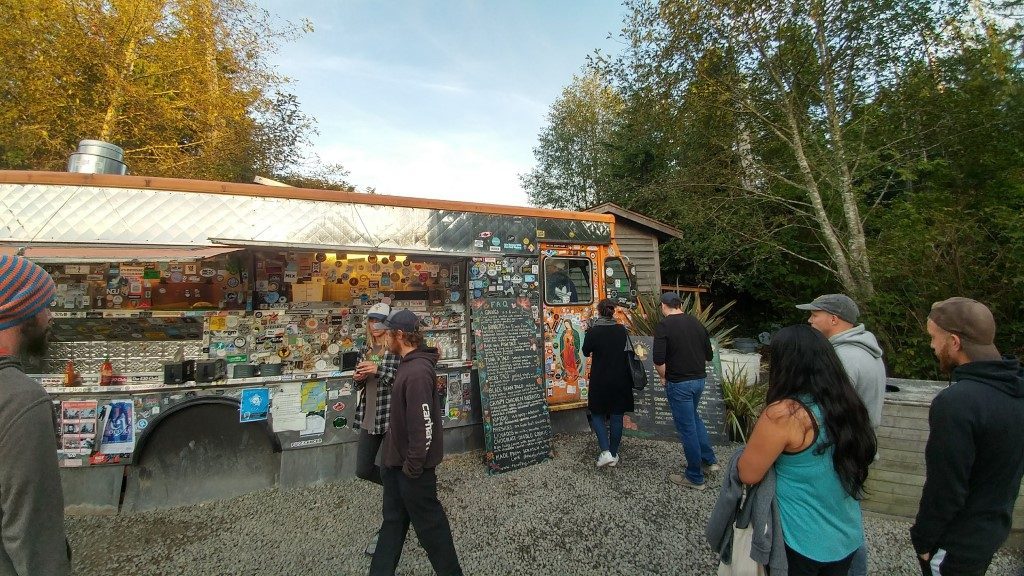이미 6시 반. 신나게 패들질을 했더니 오래간만에 배가 고파온다. 아.. 이게 얼마 만에 느끼는 허기인가? 믿고 먹는 '소보'에 또 가볼까 하다가 토피노의 명소 중 하나인 ‘타코피노 (Tacofino)’ 푸드트럭이 7시에 문 닫기 전에 얼른 가보자고 한다. 서퍼들 대상으로 재밌는 타코를 팔던 푸드트럭이 열광적인 인기를 끌어서 밴쿠버와 빅토리아에 십여 군데 지점을 가진 외식 브랜드로 성장했다는 성공신화를 가지고 있는 곳이다. 아니나 다를까 도착해 보니 치렁치렁한 머리와 얼굴 여기저기에 구멍을 뚫은 청춘들이 잔뜩 와서 북적대고 있다. 지점마다 조금씩 메뉴가 다르다고 하는데, 이곳 본점에서는 직접 담근 김치로 만든 ‘김치/돼지고기 그링가 (Gringas)’와 ‘참치 타타코 (참치 타타키로 채운 타코)’, ‘소고기 부리또’가 유명하단다. 여기에 피시 타코와 치킨 부리또까지 포함해서 주문했다. 우리가 거의 맨 마지막 줄이었는데, 정말로 7시 딱 되자 문 닫고 폐점 준비를 했다.