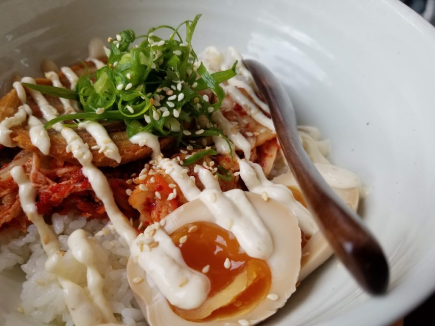이왕 이렇게 된 거, '쿠마 (Kuma)'에서 저녁을 먹고 가기로 하고, 오늘은 여기저기 이 지역 예술가들 가게나 돌아다니자고 한다. 아내는 마음에 드는 티셔츠를 하나 사고, 난 트레일러에 붙일 스티커를 두 개 샀다. 그렇게 3시 반에 쿠마가 오픈하는 시간을 기다리면서 주변을 돌어다니다가, 결국 마지막 5분을 못 참고 식당 파티오에 있는 테이블에 자리를 잡았다. 식당 오픈 간판을 걸러 나온 웨이트리스가 우릴 보고 깜짝 놀랐지만 가벼운 인사로 얼버무리고... 첫날, 점심 메뉴 중에선 카라아게만 먹고 나왔을 때부터 이 집의 김치-삼겹살 돈부리가 매우 궁금했었다. 마침 유지방 과다 섭취로 속이 뒤집어지던 중이어서 뜨끈한 사케와 함께 얼른 주문한다. 아... 또... 뜨거운 술이 들어가니까 위장이 따끔따끔해진다. 아... 좋다... 곧이어 나온 김치-삼겹살 돈부리는 반숙 달걀과 양배추 샐러드와 같이 나왔는데 (비록 삼겹살은 딸랑 한 덩이가 나오지만)... 으허헝... 간만에 김치랑 계란에 밥 비벼 먹으니까 눈물 나오려구 해. 김치의 유산균으로 뱃속의 유지방이 녹아 내려가는 것이 느껴진다. 으흐흐흐허어엉... 김치덮밥... 날 다 가져요..