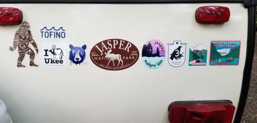한참을 달려 집에 도착했다. 캠핑 경험이 있는 많은 사람들이 동의하겠지만, 뒷정리가 끝날 때까지 캠핑은 끝난 게 아니다. 짐을 다시 나르고, 설거지와 빨래를 돌리고, 아이스 박스를 비우고 음식들을 다시 냉장고로 밀어 넣고, 다람쥐의 공격을 받은 음식들을 골라내어 버리고, 그걸 보고 또 한 번 빡치고, 바닥에 흘린 것들을 닦아내고 청소하고… 등등을 하다 보니, 벌써 밤이 늦었다. 샤워 후 남은 맥주들은 마저 마시면서 사진들을 슬라이드 쇼로 쭉 본다. 그리고 바로 며칠 전이지만 벌써 추억이 되어버린 시간들을 반추한다. 그리고 자연스럽게 다음 여행에 대해 얘길 한다. 항상 이런 식이다. 뒷정리가 끝나기 전엔 캠핑이 끝나는 게 아닌데, 뒷정리가 끝나기 전에 이미 다음 캠핑을 준비한다. 어쩌면.. 13년 전 금룡반점에 있었던 나와 지금의 나 사이에 이런 무한반복이 있었는지 모르겠다. 그리고 앞으로도 또 계속 반복되겠지. 우리 트레일러 뒤쪽엔 지난 캠핑들의 역사로 이렇게 한 줄이 채워졌다