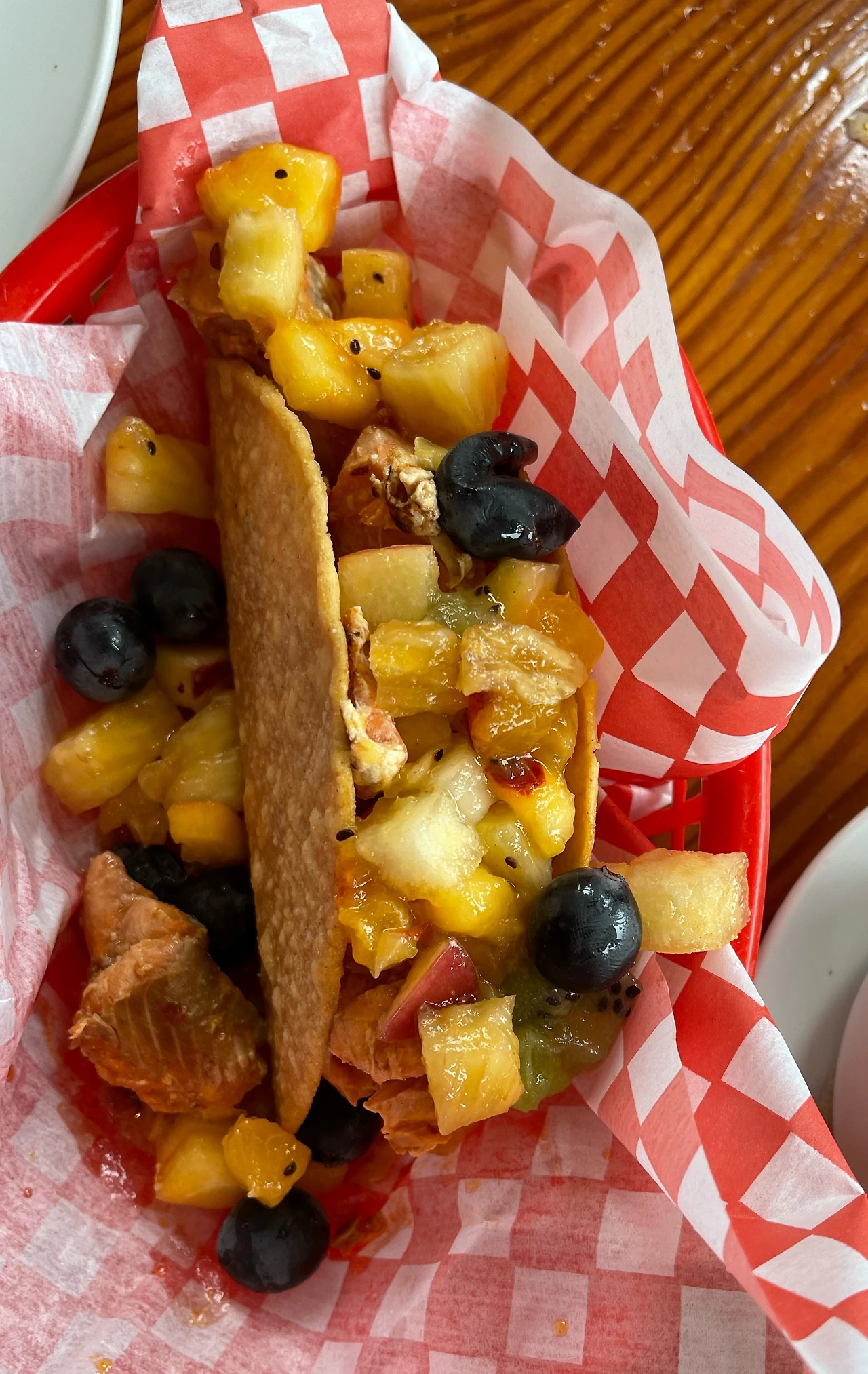아내는 해산물 차우더 작은 컵과 ‘킬러 피시 타코’라는 이 집에서 제일 인기 좋은 메뉴를 주문했다. 해산물 차우더는... 지난번과 같이 명불허전. 킬러 피시 타코는 소프트 타코셸을 가볍게 튀겨서 바삭한 식감을 만든 후, 매콤하게 구운 연어살과 각종 과일 (딸기, 포도, 망고 등) 베이스의 살사를 푸짐하게 넣어서 나왔는데, 멕시코나 텍스멕스 (Tex-Mex, 멕시코 음식을 가장한 미 텍사스 음식) 음식이라기보다는 타코를 가장한 과일 특선 안주와 같은 느낌. 옆에 다른 손님은 타코인데 어째서 사워크림이 없냐고 항의하는 것 같았지만, 유지방은 쳐다도 보기 싫었던 당시의 나에겐 아주 완벽한 음식이어서 얼른 한 개 더 주문했다. 아하하하.. 뭔 이렇게 상큼한 타코가 다 있는지. 맥주가 강하게 고파졌지만 곧 2시간 넘게 카약을 타야 하므로 일단은 자제하고.