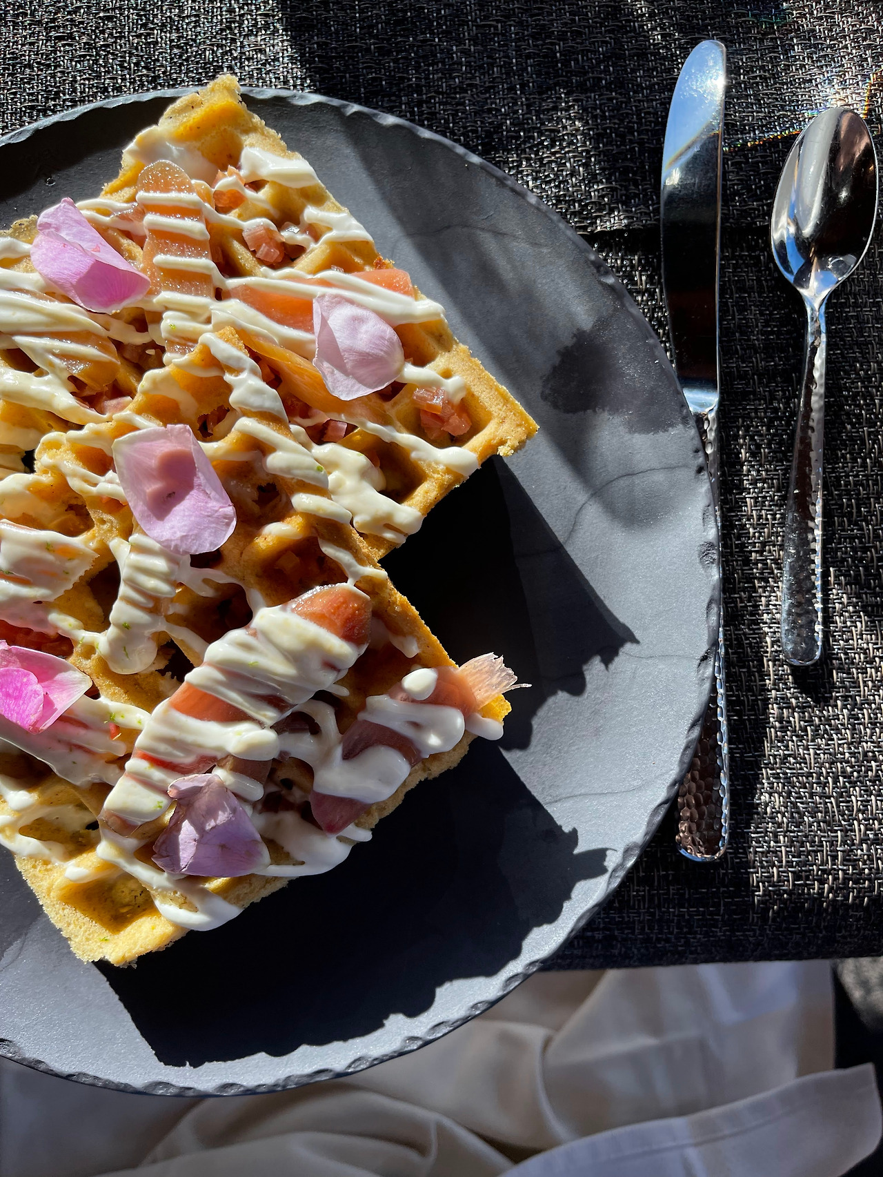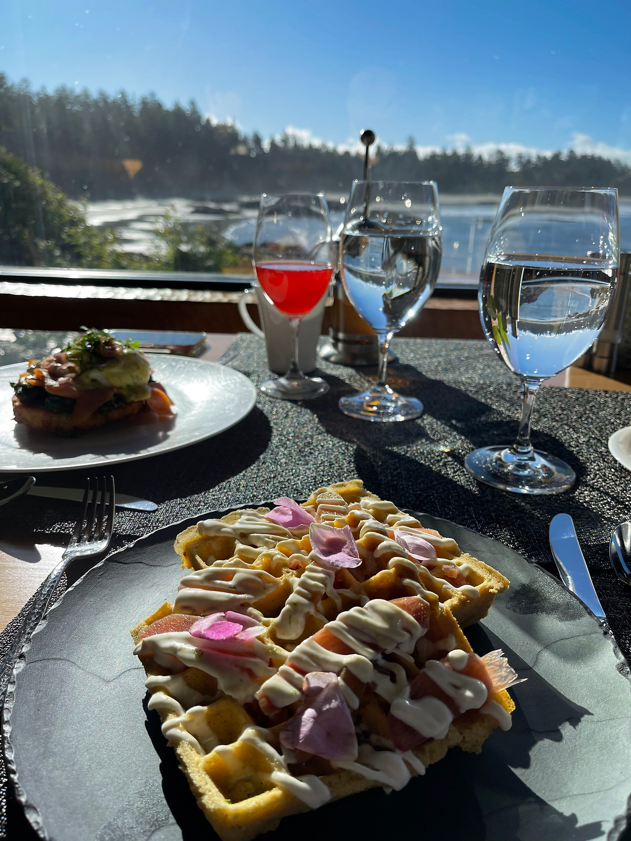 그래서인지 둘째 날, 나름 근사한 호텔로 아침 식사를 하러 가서 메뉴판을 봤을 때, 이럴 때 아니면 또 언제 제대로 된 와플을 먹어보겠나 싶었다. 토피노에 올 때마다 들르게 되는 이곳 '위카닌니시 호텔 (https://www.wickinn.com/)'의 'The Pointe' 레스토랑은 마치 오늘 밤 주인이 되는 것처럼 호사스러운 외식 경험을 전해주는 저녁 코스도 좋지만, 아침 브런치 역시 원형 벽을 가득 채우는 통창 너머 '체스터맨 해변 (Chesterman Beach)' 풍경과 함께 적절한 가격에 수준 높은 음식을 먹을 수 있다는 점에서 많은 사람들로부터 추천을 받는다. 대신 아침 메뉴의 경우 주방의 작업 부담이 적은 메뉴들로 구성되어 있는 편이다. 심지어 작년에는 있었던 햄버거도 올해는 메뉴에서 빠져있었다.