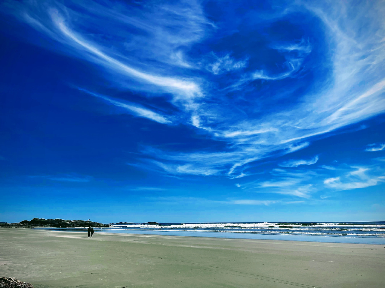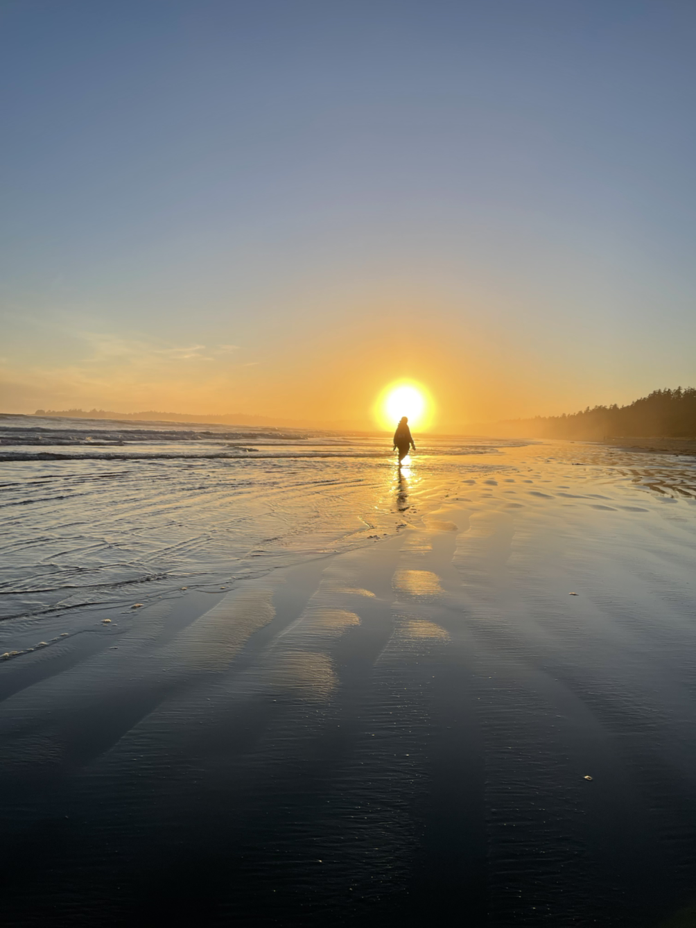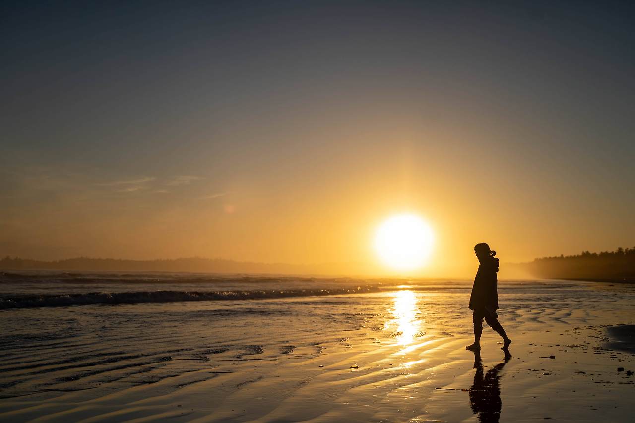 일몰 구경을 위해 해변으로 내려가려면 화재 예방을 위해 모닥불을 어느 정도 정리해야 한다. 그런데, 하지가 바로 엊그제여서 그런지 도무지 어스름이 내릴 생각을 안 한다. 캠핑장 이곳저곳을 뛰어다니면서 간신히 잡은 인터넷 신호에 의하면 이날 일몰시간은 9시 30분. 그럼 9시 15분경에 내려가 보면 되겠지 하면서 천천히 가봤더니... 해 위치만 서쪽 바다 위에 걸쳤을 뿐 아직도 강렬한 햇살은 한낮과 같다. 어제처럼 강한 바람이 있는 것도 아니라서 아내는 "아이구.. 선글라스를 안 가져왔네..." 하며 발을 동동 구른다. 토피노에 5년째 캠핑을 오고 있는데도 이렇게 화창한 저녁은 처음이다. 나 역시, 동네방네 "토피노는 항상 비 와요. 노상 비 와요. 그냥 그러려니 하고 우중 캠핑해요..."라고 광고를 해댔는데, 막상 이런 쌩쌩한 저녁노을을 보고 있자니 계면쩍기 그지없다. 하긴, 뭐, 연평균 203일 비가 온다면, 적어도 백일 정도는 화창한 날도 있는 게 당연한 거 아닌가? 흐린 날, 해무와 구름과 석양이 섞여 만들어내는 거무튀튀, 붉그스레, 푸르둥둥, 누리끼끼한 하늘도 좋지만, 이렇게 푸른 하늘에 쨍한 저녁 태양의 일몰도 보기 좋다.