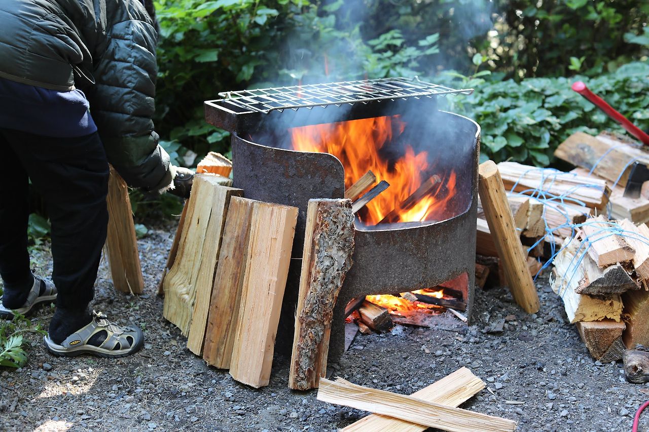 아내가 불을 피우려고 온갖 고생을 했지만… 역부족이다. 기름 먹은 배추 박스 조각을 깔아보기도 하고, 부채질도 연신 해대 보지만 종이에만 잠깐 붙다가 금세 꺼진다. 장작불에 고기 한번 구워보려 했는데 이러다가는 해가 지게 생겼다. 경험상, 이럴 땐 별 다른 방법이 없다. 장작을 가능한 얇게 얇게 쪼개는 수밖에. 하지만 젖은 장작은 그것도 쉽지가 않아서 막판에는 거의 완력으로 나무 결 따라 닭 가슴살 찢다시피 해서 직경 10센티 정도의 얄팍한 불쏘시개들을 만들어 두었다. 그런 후 박스지를 바닥에 넣고 그 위에 불쏘시개를 쌓은 후, 또 그 위로 박스에 불을 붙여 계속 집어넣는다. 이러다 보면, 결국 젖은 나무에 불이 붙는 온도에 도달하게 된다.