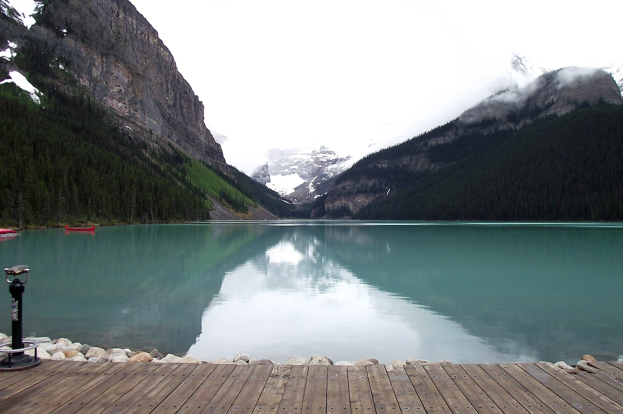 주 경계를 지나 앨버타 주로 진입하면 시차가 발생하기 때문에 시계를 한 시간 앞당겨야 한다. 요호 국립공원을 떠나 밴프로 향하던 중, 마침 지나가는 길이어서 캐나다 록키의 시그내쳐라고 할 수 있는 루이스 호수 (Lake Louise : 이름은 생소할지 모르지만, 사진을 보면 누구나 알 수 있는 그곳)에 들러 봤지만, 여전히 구름이 잔뜩 끼고 부슬비가 내리는 날씨인지라 (그리고 나라는 인간이 원래 자연경관에 감동받는 일이 적어서), 그렇게 까지 인상 깊지는 않았다. 나중에 아침에 햇빛이 반짝일 때 다시 오기로 하고 캠핑장으로 향했다.