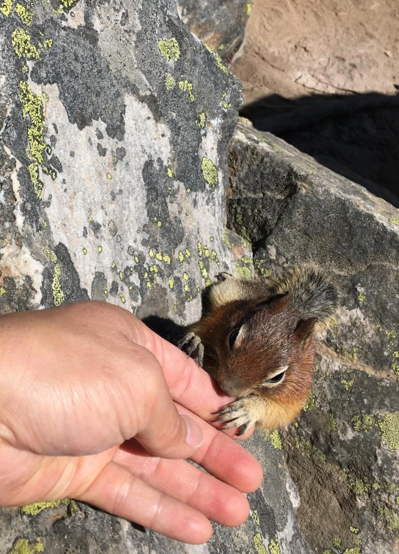 아그네스 호수를 지나서는 꼭대기까지 자갈이 덮인 비탈길이 이어졌는데, 자칫 중심을 잃었다가는 저 아래까지 미끄러지기 십상이었다. ‘아.. 정말… 이렇게까지 해서 올라가야겠냐..’ 싶었는데, 막상 올라갔더니.. 뻥 뚫린 경치가 왠지 숨통까지 뚫어주는 것 같긴 했다 (뭐. 사실.. 숨이 트이는 게 아니라, 숨찬 오르막길이 겨우 끝난 거였지만). 마침 날씨마저 청명해 줘서 저 멀리 루이스 호수 입구 쪽에 있는 페어먼트 호텔까지 뚜렷이 보였다. 바위에 걸터앉아서 땀을 식히며 초코바 하나를 먹고 있자니, 관광객들에게 익숙한 다람쥐 한 마리가 달려와서 안긴다. 미안하다. 우리 동네 야생동물들에게는 이미 먹을 건 안 주고 뻥카만 날리는 인간으로 이미 유명한데.. 넌 몰랐겠구나…