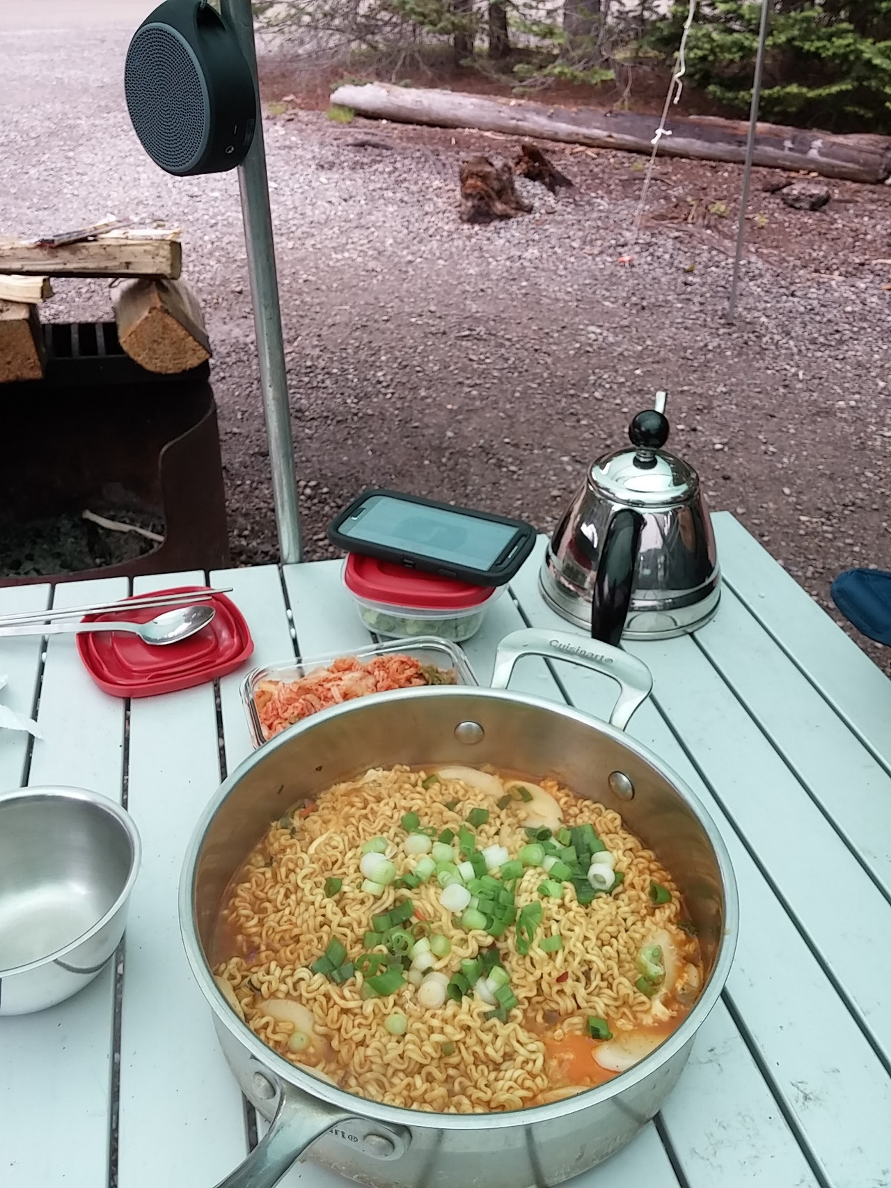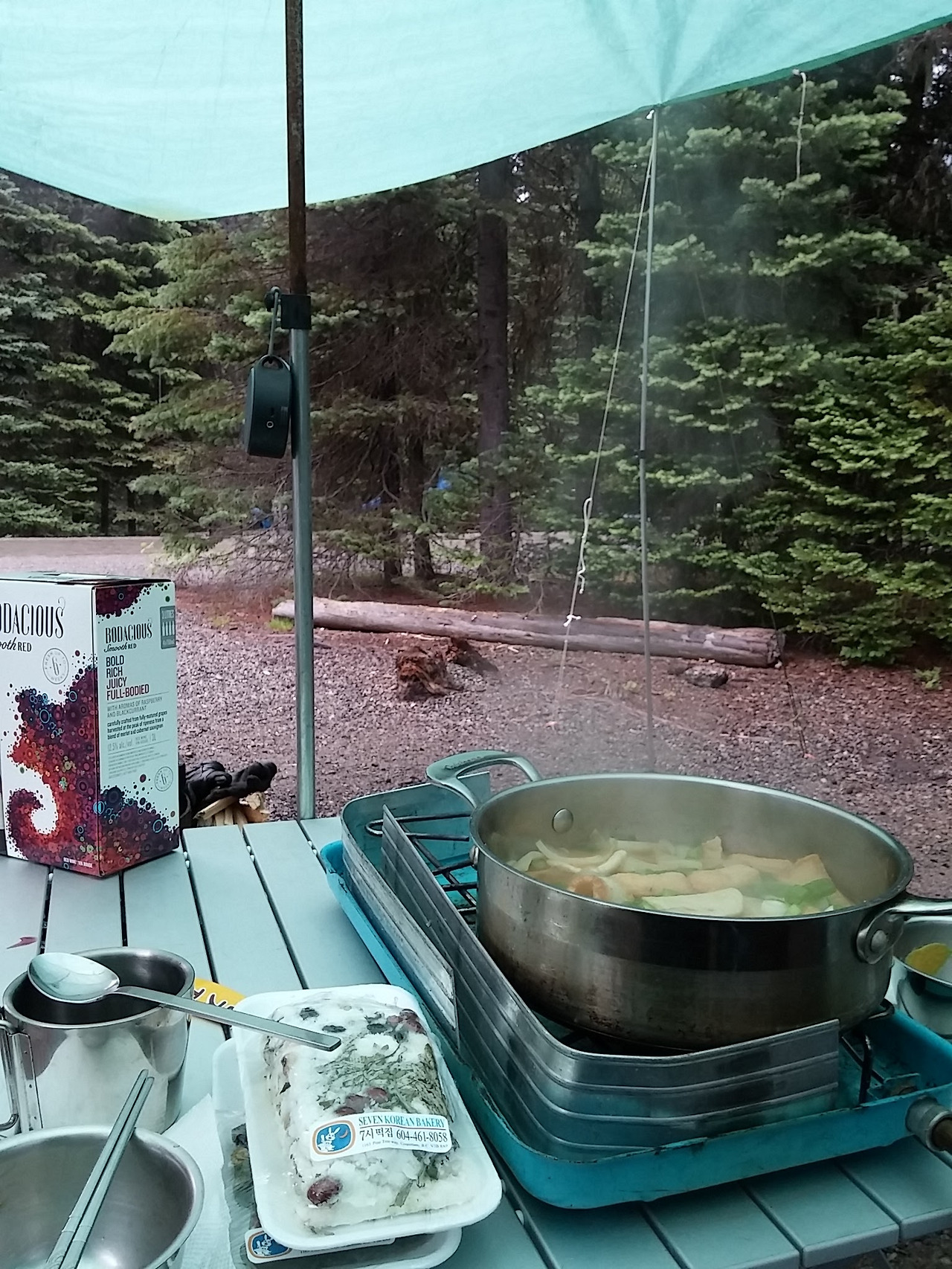 날씨가 서늘해지고 빗방울이 떨어지는 감이 있어서 도착하자마자 타프로 천막을 만들고, 장작을 패서 불을 때고 오뎅국을 끓이기 시작했다. 캠핑장에서 모닥불을 피우는 행위는 애초에는 난방이 주목적이었겠지만 이제와서는 왠지 엔터테이닝한 측면도 없지 않아서, 마치 영화를 한 편 보거나 비디오를 빌리는 심정으로 캠핑장에서 땔감 나무를 돈 주고 구입하는 게 아닌가 싶다. 하지만, 한 뭉치에 5불 하던 예전이나 12불씩 하는 요즘이나 그냥 태워버릴 나무에 쓰는 돈이 아깝기는 매한가지여서, 일요일 오후 이웃 캠퍼들이 떠난 자리에 혹시 남겨둔 장작이 없는지 둘러보고 다니곤 했다 (지금도 단돈 몇 푼을 아껴보고자 공짜 장작을 구해보려고 자재 운송용 빠렛뜨를 쪼개서 쓰는 등 여러 노력을 한다).