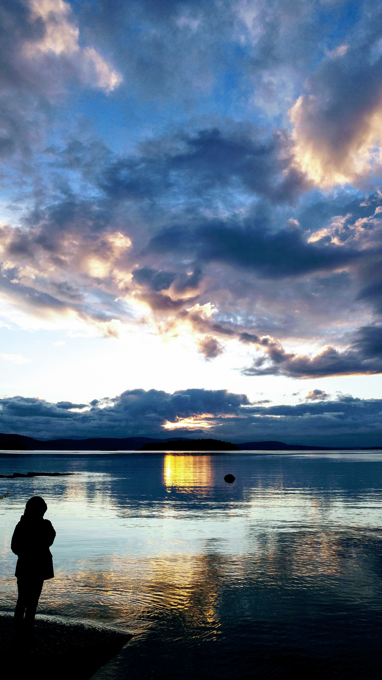 캠핑장으로 돌아와서 사 온 야채들과 소시지를 볶아 와인과 함께 먹으면서 또 해질 시간을 기다린다. 저녁을 너무 일찍 시작했는지 먹을 만큼 먹고, 떠들 만큼 떠들었는데도 해가 질 생각을 안 한다. 결국 음식들을 또 모두 치워놓고, 캠핑장 주변으로 어슬렁어슬렁 산책을 했다. 몬테규 선착장에도 가보고, 이곳저곳 다니다 보니 이미 7시. 하늘이 슬슬 어둑해지기 시작했다. 이날 저녁 하늘은 구름으로 덮여있었는데, 저 멀리 보이는 작은 틈 사이로 저녁놀이 집중적으로 새어 나와 바다를 비췄는데 마치 하늘에서 쏟아지는 노을빛의 샤워 같다는 느낌을 받았다.