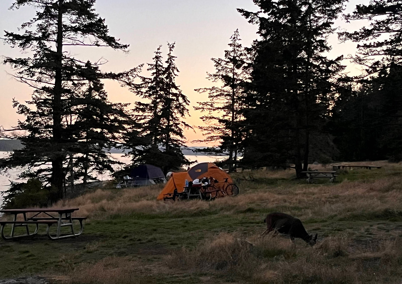 일단 주차를 한 후 자전거를 끌고 캠프 사이트를 찾는데... 아... 눈앞에 인디고 블루의 바다가 주와아아아아악 들어오니 가슴이 벅차오른다. 이곳은 다른 BC 주립공원 캠핑장과 달리, 캠프 사이트가 자갈 바닥이 아닌 야생 풀밭 위에 조성되어 있어서 초원과 바다의 조화가 무척 아름답다. 우와아아아아... 근데.. 성수기가 지났다고는 하지만 주말이라서 그런지 제법 캠퍼들이 많이 들어왔는데, 어떻게 이렇게 해가 잘 들고 바다가 정면으로 보이는 사이트가 비어 있는 거지? 궁금했지만... 뭐 개이득, 이러면서 짐을 옮기기 시작했는데, 잠시 후 사이트 바로 앞에 누군가가 만들어둔 샤머니즘의 흔적을 발견하고는 기겁했다. 근데 뭐. 캠핑장의 지박령...이라는 것도 제법 멋들어져 보이잖아?