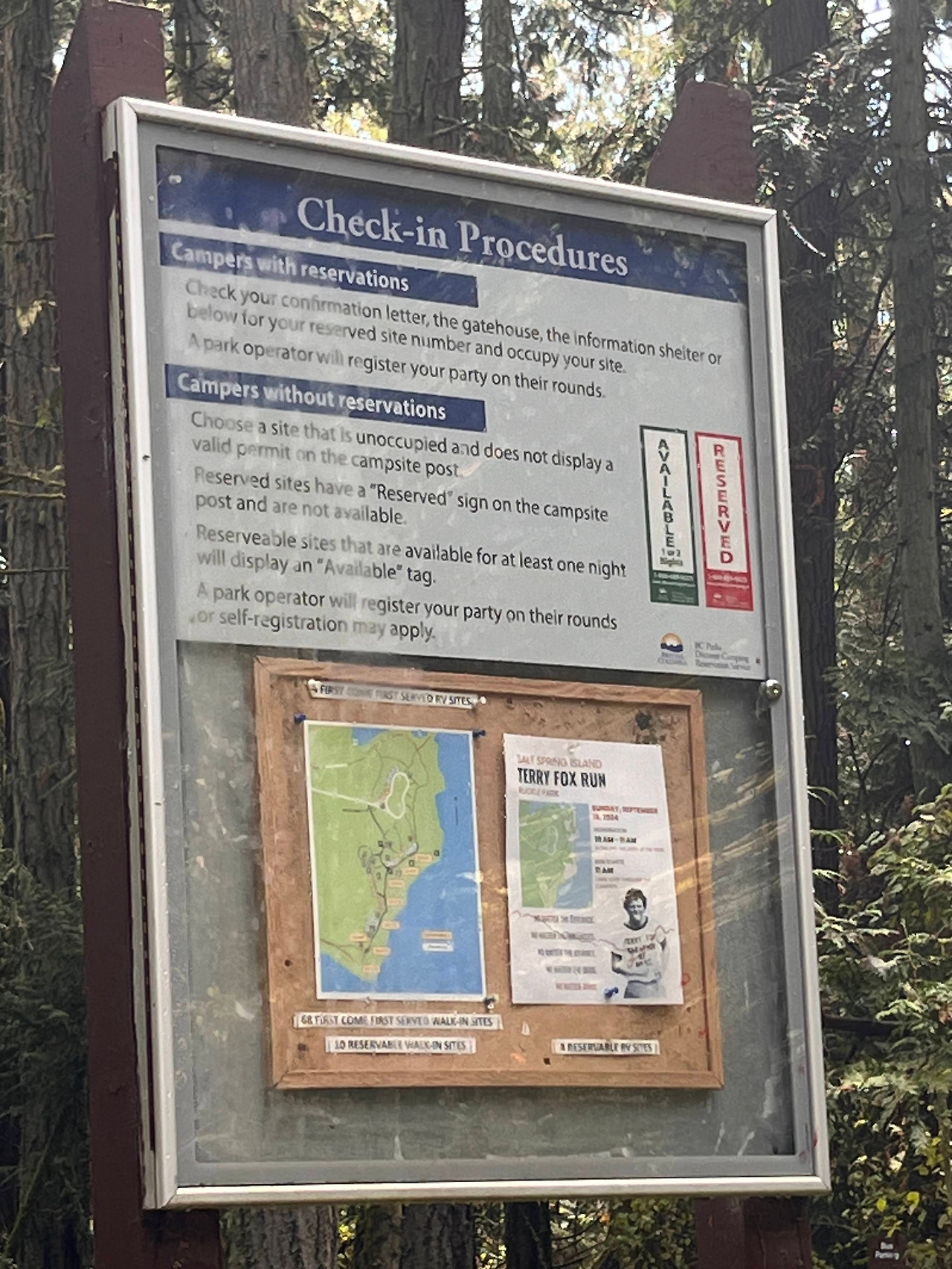 게다가 한참 후 도착한 갠지스 다운타운에는 주말 장터가 열리는 바람에 도무지 주차를 할 만한 곳을 찾을 수가 없었다. 아놔... 빽빽한 다운타운 골목을 몇 바퀴나 돌다가, 결국 내가 계속 도는 동안 아내만 내려서 생수를 사 오는 걸로 계획을 바꿨다. 주말 섬마을의 시내 교통 상황에 대해 너무 얕봤다고 해야 하나. 트레일러를 끌고 다니는 것도 아니니 아무리 그래도 자리 하나는 찾을 수 있을 줄 알았는데. 이리하여 내가 원하든 원하지 않든 자전거 캠퍼들보다 먼저 캠핑장에 도착하게 되었다. 이때가 12시 반.