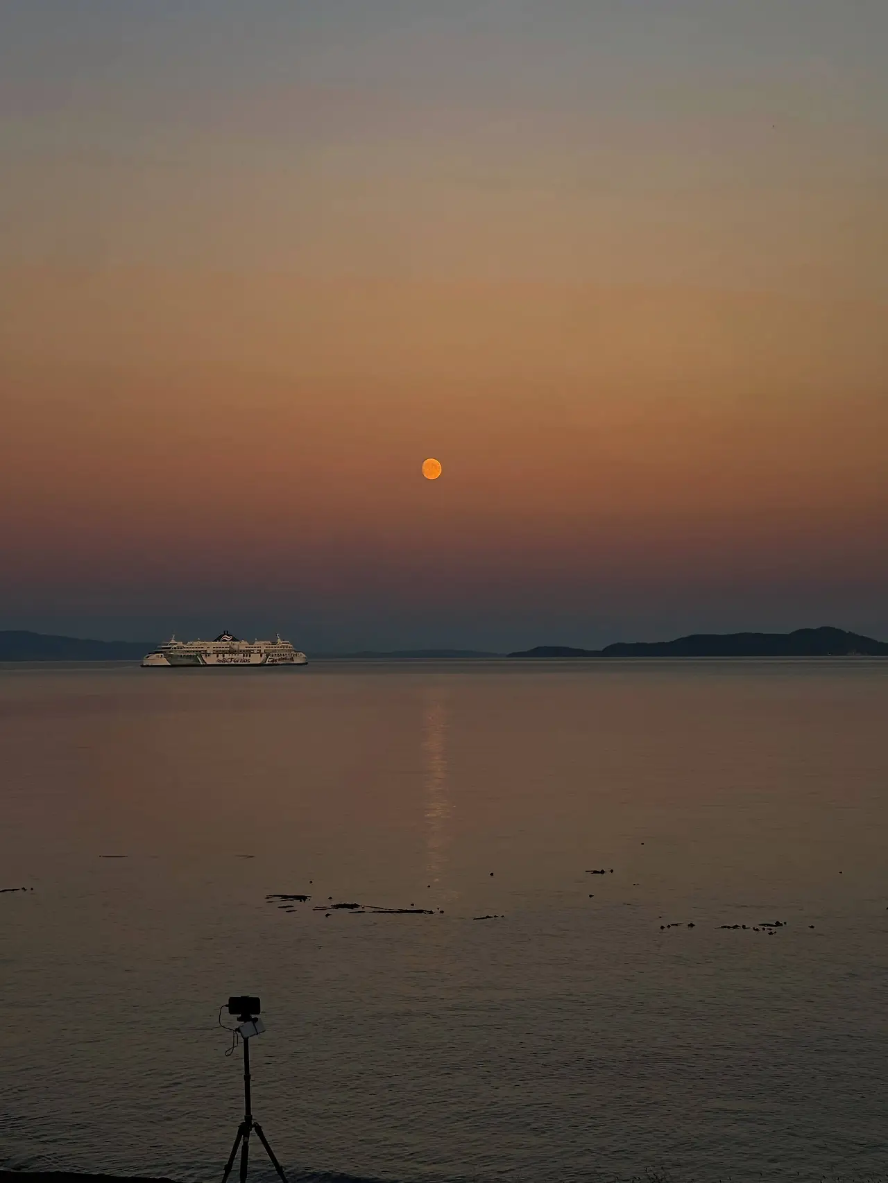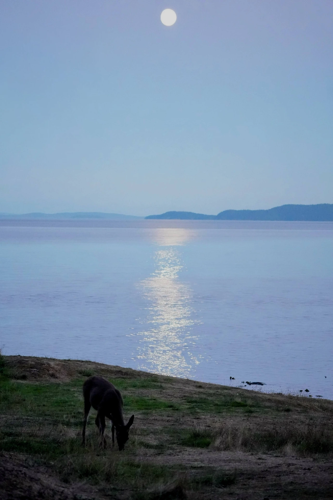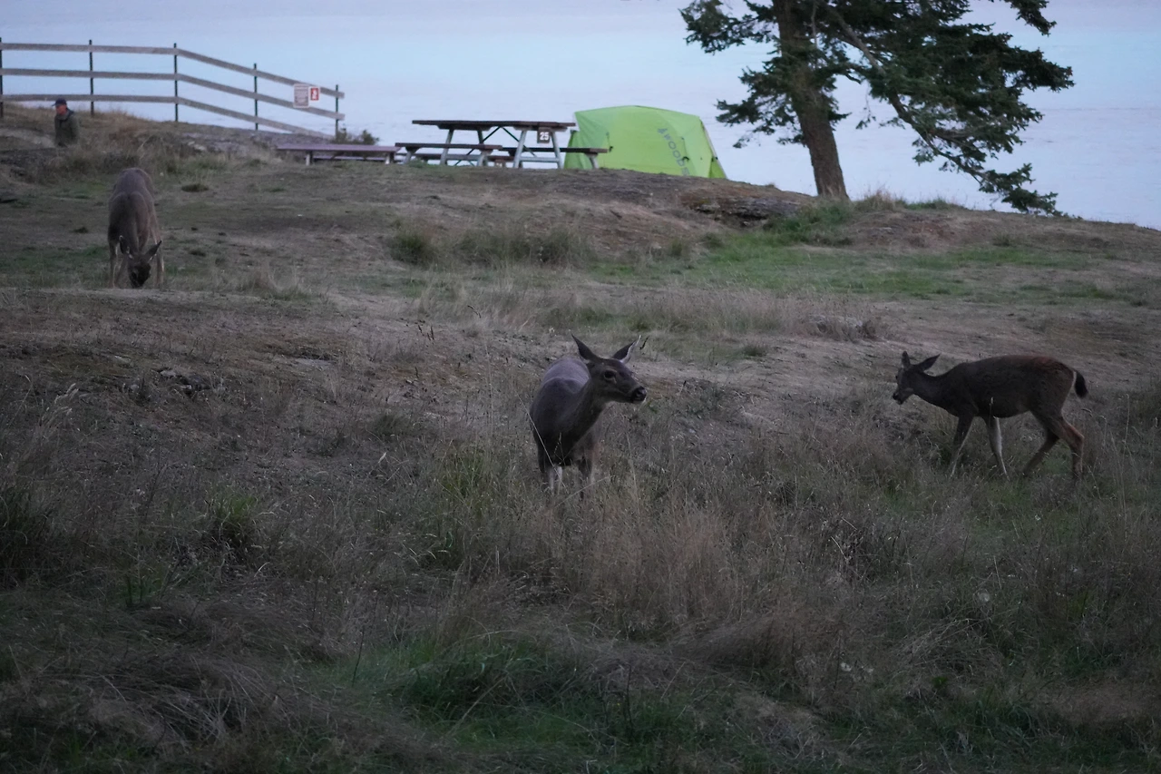 다음날 새벽, 화장실로 향하던 아내에게서 카톡을 받았다. 사슴들이 길목을 막고 있어서 화장실을 못 가겠다고. 아, 맞다. 이 캠핑장에는 사슴이 있지. 6년 전에 왔을 때에도 어스름이 내리거나 여명이 다가올 때면 항상 사슴들이 어슬렁거리며 캠핑장을 활보했었다. 캠핑장뿐만 아니라 섬 전체 이곳저곳에 사슴이 많았었다. 그런데 어쩐지, 올 해의 사슴은 예전 그 사슴에 비해.... 뭐라 할까... 조금 무섭게 생겼다. 예전에는 갈색 가죽 위로 얼룩무늬가 있던 전형적인 꽃사슴이었는데, 지금은 회색 가죽에 뿔도 좀... 악마 뿔처럼 생겼다고 해야 하나? 가느다랗고 길쭉한 뿔이 휘어져있었다. 그렇다고 송곳니가 삐죽 길게 난 고라니는 아니었지만. 그렇더라도 사슴들이 한가롭게 어술렁거리며 풀을 뜯고 있는 모습 뒤로 광활한 바다가 펼쳐져 있는 새벽, 바다를 가로지르는 페리, 그리고 그 위로 해가 천천히 떠오르는 걸 보고 있자니.. 이게 정말 꿈속에서나 볼 수 있는 풍경이 아닌가 싶어서, 새벽 요의를 참으며 한참을 멍하니 쳐다보고 있어야 했다.
