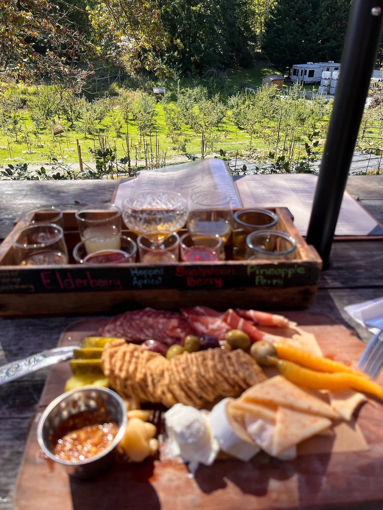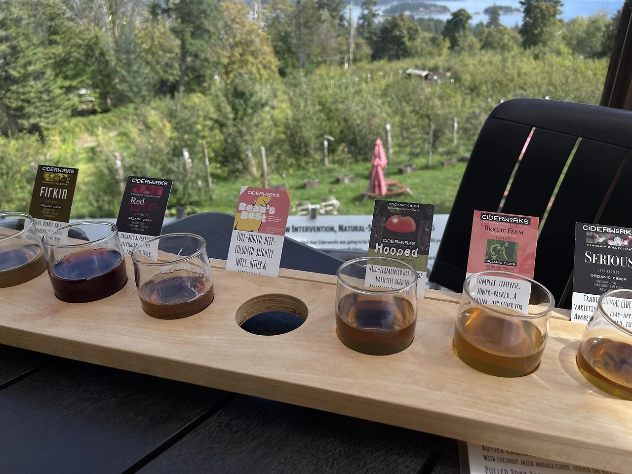 '스프링 와일드 사이다(https://saltspringwildcider.com/)'는 전날 갔던 '사이다 웍스'와는 달리 좀 더 기업화되어 있는 곳으로 이 양조장의 사이다는 광역 밴쿠버와 밴쿠버 섬에 있는 웬만한 주류매장에서 쉽게 구할 수도 있다. 하지만 찾아가는 길은 여전히 오리무중. 이 정도 기업이면 도로에 입간판이라도 하나 세울 만한데. 점심시간 즈음에 도착해서 그런지, 아니면 금요일이라 그런지 제법 넓은 다이닝 공간 테이블은 많이들 채워져 있었다. 건물 뒤편으로는 더 넓은 피크닉 공간이 있었는데, 여기는 주류 서비스 라이선스가 안 나왔다는 이유로 이곳 테이블을 이용하려면 셀프서비스만 가능했다. 그래도, 저 아래 펼쳐져 있는 사과농장을 보면서 한 잔 하는 게 더 낫지.