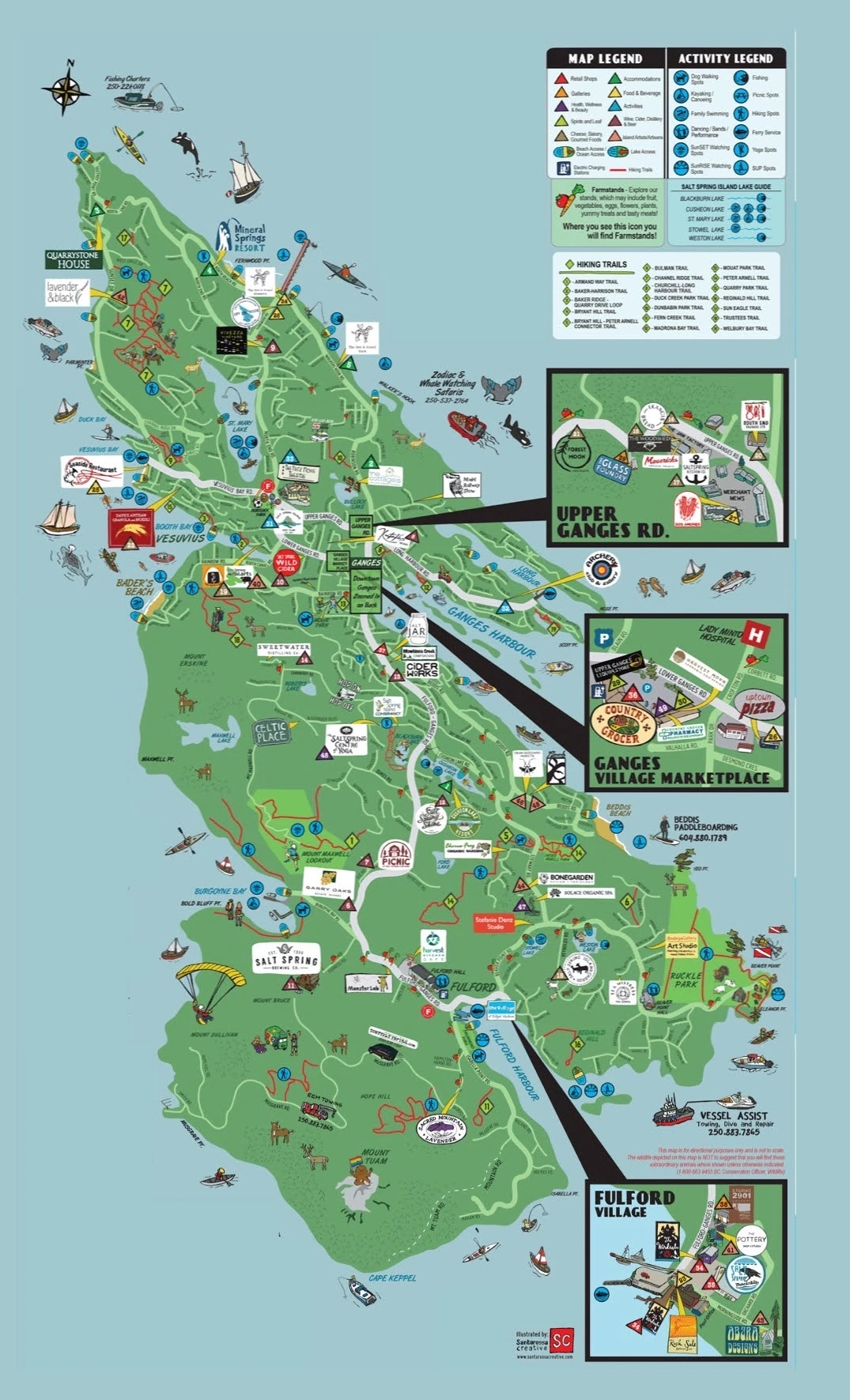 솔트 스프링 섬에 있는 사업체들의 한 가지 특이한 공통점은, 도무지 어디가 진입로인지 알 수가 없다는 거다. 물론 섬을 관통하는 주요 도로들 자체가 그냥 숲이나 벌판 한가운데를 뚫어서 만든 것이기 때문에, 뭐라 할만한 간판을 달 수 없다는 것도 있겠지만, 그래도 '솔트 스프링 치즈'처럼 유명한 비즈니스들은 진입로 100미터 전방 행길에 무슨 안내판이라도 세워둘 만 한데 그런 걸 쉽게 찾아볼 수 없다. 구글맵 역시 정확한 정보를 가지고 있는 게 아니라서, 구글맵을 안내를 받고 따라 도착한 어느 민가에는 작은 입간판에 "치즈 공장으로 가려면 오던 길로 50미터 더 가시오"라고 쓰여있었다.