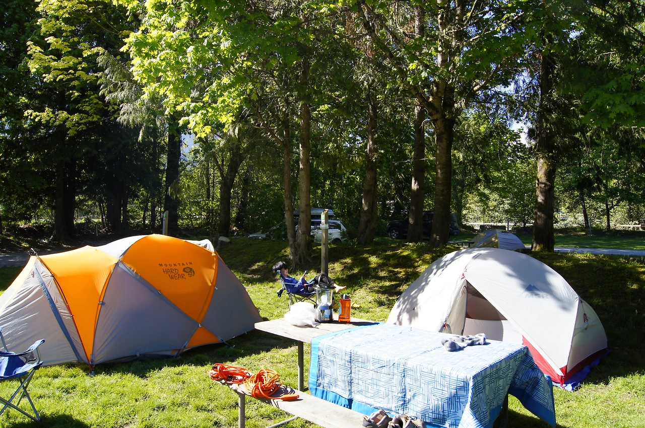 스쿼미시 시영 캠핑장은 넓디넓은 잔디밭을 사이트별로 나눠 테이블과 모닥불 화로를 배치해 두었는데, 바닥이 BC주립공원처럼 자갈/돌바닥이 아니라서 텐트도 무척 수월하게 설치했다. 중고로 구한 텐트의 필드 테스트를 하는 거라서 안에 들어있던 모든 밧줄과 팩들을 빠짐없이 사용하여 설치를 했더니 왠지 빤듯하게 각이 제법 나오는 것 같았다. 그 안에 깔판을 두고 침낭을 덮어 자는 건 크게 문제가 되어 보이질 않았지만, 왠지 2인용 백패킹 텐트가 좀 작은 듯했고, 그렇다고 3인용을 산다면 그만큼 크기와 무게가 늘어나는 것이어서 그냥 이쯤에서 타협하기로 했다.