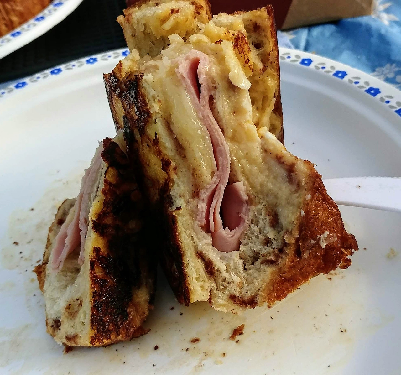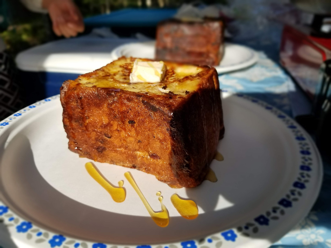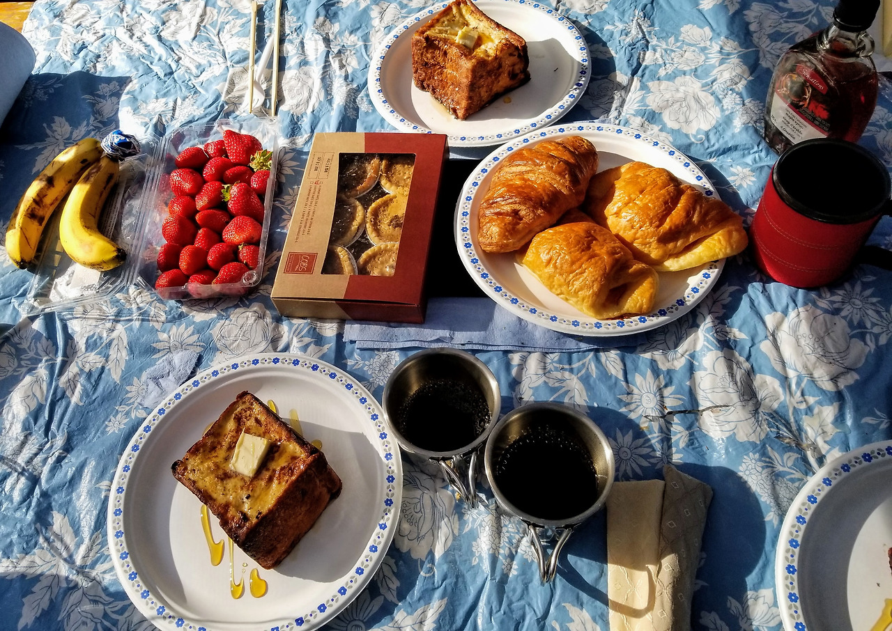 그리고 다음 날 아침엔, 전직 제빵사였던 L 님의 회심의 역작 ‘버터 듬뿍 몬테크리스토’이 등장했다. 그것도 미리 잘라진 식빵이 아니라, 통식빵을 안을 파내고 슬라이스 햄과 치즈를 채워 넣은 후 버터에 팬 프라이를 한 것이어서, 이것이 어떻게 캠핑장에서 가능한 음식인가.. 하며 놀라기도 했고, 한편으로는 이번에도 만만치 않게 입이 호사스러운 캠핑이 되겠거니 했다.