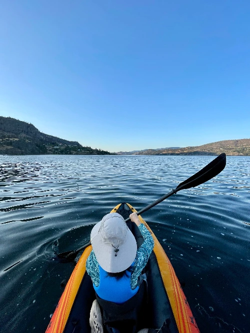 그리고 이 피부 발진은 6일 차 저녁이나 되어서야 안정을 찾게 되었다. 하지만 그즈음엔 이미 폭염주의보가 해제되고 저녁에는 밖에 나와 앉아있을 수 있을 정도로 선선해졌기 때문에, 그리고 녹조류 경보도 해제되었기 때문에, 끝까지 원인을 특정하지 못한 채 사라졌다. 기분이 좋아서 다시 호수로 나가 본다. 카약을 들고. 저 멀리 산등성이 위에 해가 걸려있다가 금세 저문다. 데워진 호숫물의 온기와 기분 좋게 서늘한 바람이 섞여서 카약을 가른다. 호수 표면은 벌써 검푸르게 어두워진 물색깔 위로 아직 밝은 톤이 남아있는 하늘을 반사한 물결이 흔들린다. 해질 무렵 뱃놀이가 이렇게 재미있다니. 아쉽게도 카약은 오늘까지만 타고 내일은 하루 종일 말릴 예정이다 (이때까지는 이 방법이 먹혀들어갈 줄 알았습니다). 한 시간 좀 넘게 카약을 즐기다가 돌아와서 간만에 야간 음주를 한다. 광역 밴쿠버 캠핑에서는 밤에 밖에서 술 마시는 재미가 캠핑의 백미였었는데, 여기서도 더위가 한 풀 꺾이니 밤바람을 맞으며 밖에 나와 앉아 있을 수도 있다. 가려움증도 훨씬 덜해졌다. 밤공기에 약간 온기가 남아있는 것이 한국의 시골 여름밤 같다. 어릴 적 방학 때 외갓집에 갔던 기억이 난다. 술을 마시던 와중에 옆 사이트 트럭 위로 수리부엉이가 날아와 앉는 걸 보게 되었다. 신기하다. 야생 부엉이는 난생처음이다.