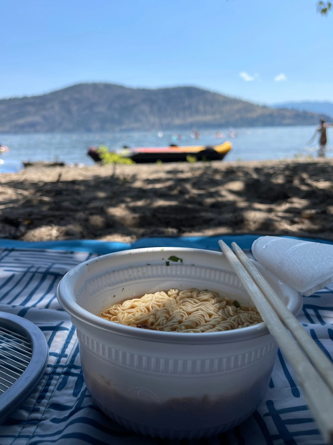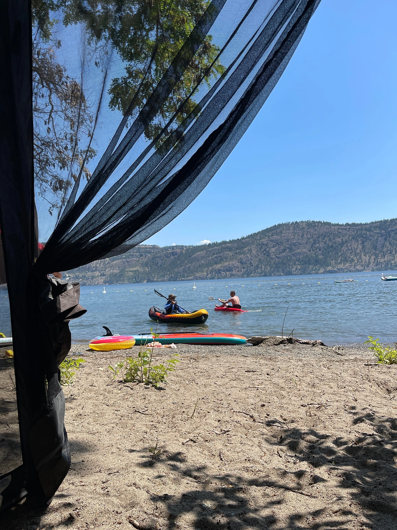 이날도 아침부터 카약을 타러 나섰는데 이상 고온으로 호수에 녹조류가 무성하게 자랐으니 조심하라고 한다 (Blue-Green Algae Alert). 조심하라고? 수영하는 사람들 미끄러질까 봐 그런가? 녹조류가 피부 알레르기도 유발한다는 사실을 알게 된 건 조금 나중 일이었다. 한 시간 정도 뱃놀이를 유유하게 즐기고 돌아오니 아직 아침 9시. 호숫가는 여전히 한가하다. 오늘은 이 호숫가에서 나무 그늘을 찾아 한번 뭉게 볼 생각이다. 카약을 해변에 묶어두고 사이트로 돌아가 돗자리와 모기장 텐트를 가져온다. 글 쓰고 노래 듣고 사람들 구경하는 동안 아내는 종종 호수로 나가 튜브에 몸을 싣었다. 어느덧 지면에 열기가 차오르자 인플레이팅 카약이 무척 빵빵해지는 바람에 종종 바람을 빼줘야 했다. 12시쯤 되어 조금 출출해지자 간식 아이디어를 냈는데, 해변에 앉아 물멍을 하면서 먹는 사발면의 맛은 또 각별했다. 그리고 솔로 카약킹을 시작한다. 돗자리와 책을 해변에 덩그러니 남겨두고 둘 다 나가서 물놀이를 할 수는 없었기 때문이다. 아무리 캠핑장에는 사소한 절도 사건이 없다고는 하지만 한국이 아닌 다음에야 소지품을 방치하고 다닐 수는 없다. 예전에 둘이서 2인용 카약을 타다가 하도 손발이 안 맞는데 질려서 각자 솔로 카약을 해야겠다고 합의한 적이 있었는데, 역시나 배를 나만의 의지대로 조정할 수 있다는 건 기분 좋은 일이었다.