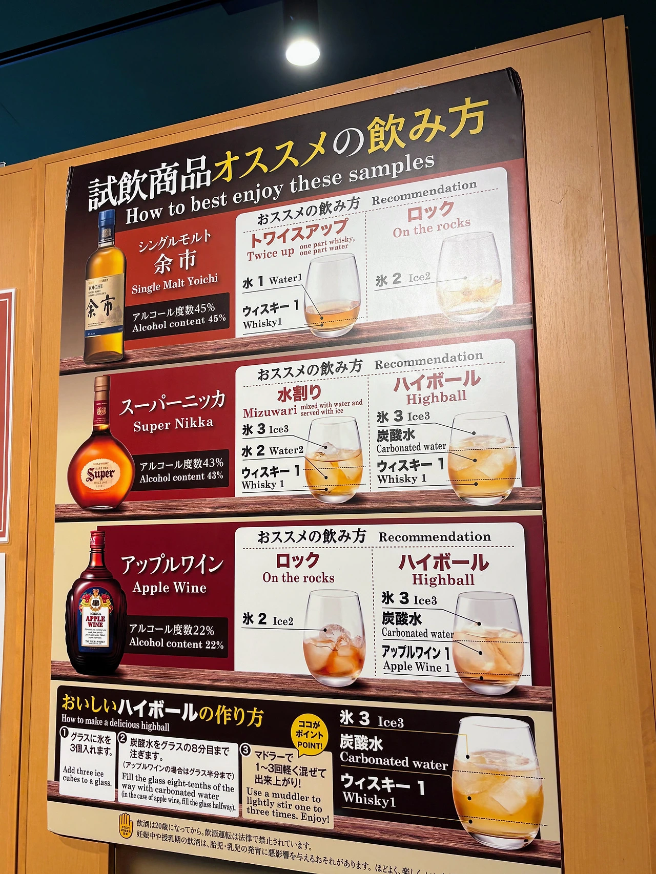 그리고, 투어에 참가한 사람도 알고 투어 가이드도 모두 알고 있는, 모든 양조장 투어의 백미는 시음회. 삿포로 맥주 투어도 마찬가지였지만, 투어 시작할 때부터 운전을 안 할 거라는 서명을 해야 하고, 시음회에서 술을 받기 직전까지도 운전을 할 것인지 질문을 받는다. 음주운전 처벌에 엄격한 일본 답다. 맥주 2잔의 시음이 포함되어 있는 삿포로 맥주 양조장의 프리미엄 투어는 인당 1000엔을 내야 했지만, 위스키 3잔 시음이 포함된 요이치 증류소의 투어는 무료였다. 물론 삿포로 시내가 아니라 요이치까지 기차 타고 오긴 해야 했지만, 그들의 대표작인 요이치 싱글몰트와 1963년 첫 출시된 대표적인 블렌디드 위스키인 슈퍼 닛카, 그리고 애플 와인을 1온스 정도씩 마실 수 있었는데, 각 음료를 마시는 추천법도 제공되면서, 탄산수나 얼음, 생수 같은 것도 카운터에서 직접 가져와서 각자 자신들 취향에 맞게 마실 수 있었다.