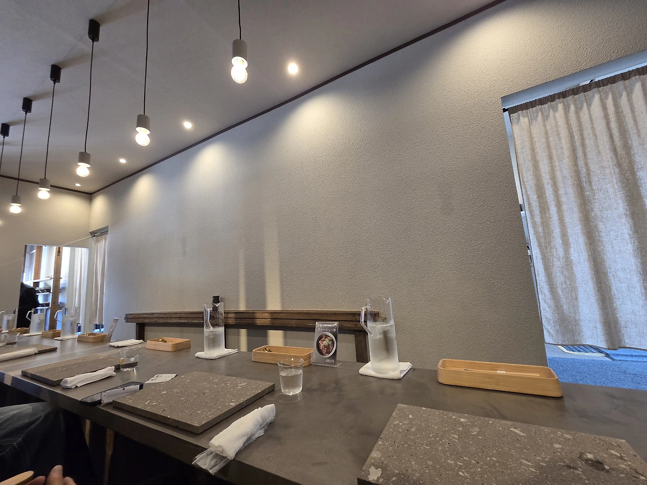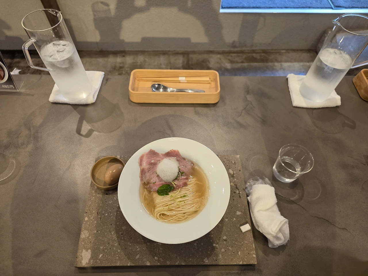 요이치 역에서 길 건너에 바로 있는 집에 오픈런해서 들어갔는데, 입구에 식권을 뽑는 기계가 있어서.. 음.. 일반 라면집과 비슷한 분위기겠거니.. 했는데, 테이블이 하나다. 기다란 석재 테이블에 나란히 앉아 벽을 보며 (참선하는) 먹는 구조였다. 음.. 이건 뭔가요? 알고 보니 예술하는 집이었네. 점점 더 불안해진다. 일반 대중 음식점이라면 적어도 청어 비린내를 빼려는 노력이라도 했을 법한데... 이 집은 왠지 정면 승부할 것 같다. 아니나 다를까. 국물 한 숟갈 뜨자마자...
