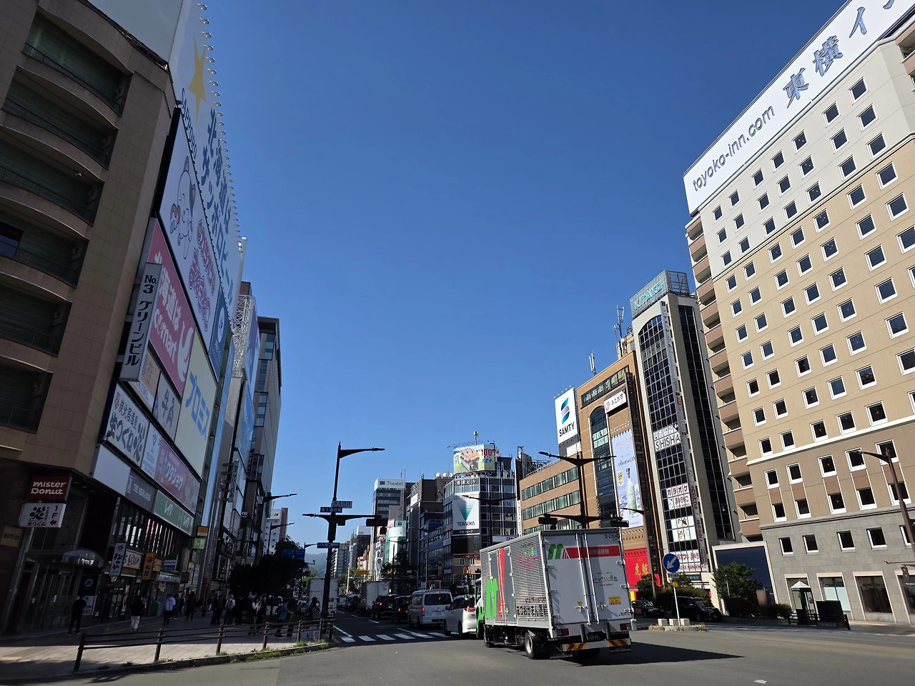 스스키노는 삿포로 최대의 환락가라고 들었는데 평일 아침이라서 그런지 한산해 보였다. 하긴. 잘 나가는 환락가일수록 평일 아침은 한가해야겠지. 어젯밤에 달렸을 테니까. 그래도 한 면이 완전히 광고판들로 어지럽게 뒤덮인 건물을 보고 있자니, 저기 위층에 입주한 사업체들은 창밖을 아예 못 보고 일을 하겠구나 싶었다. 물론 파친코나 유흥주점일 경우 크게 상관은 없겠지만.