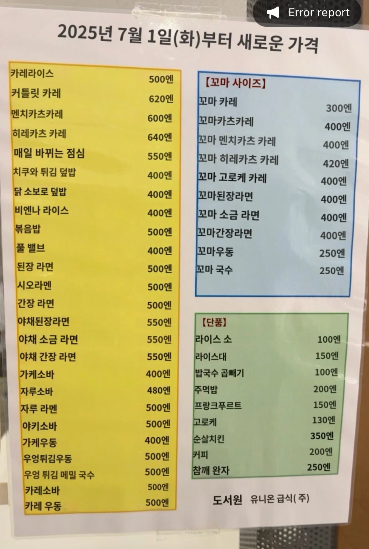 테이블 4개 정도 그리고 창가에 카운터 탑을 둔 소박한 식당 주방에는 조리사 2명이 일하고 있었다. 역시 식권 발매기에서 식권을 산 후 주방 카운터에서 주문을 하는 방식. 물은 셀프. 주로 일본식 카레를 베이스로 한 음식들이 있었고 라면도 팔고 있었는데, 시간이 어정쩡해서 그랬는지 도서관 이용객보다는 주변에서 일하는 사람들이 작업복을 입고 앉아서 먹고 있었다. 아니나 다를까, 엊그제 홋카이도 대학 학생식당에 비해 양이 넉넉한 편이었네. 메뉴판에는 올해 7월부터 가격이 인상되었다고 적혀있는데, 최근에 일본에서 쌀이 품귀라는 소식을 들었던 터라 이해가 갔다. '오늘의 점심'과 돈까스 카레 중 고민하다가.. 돈까스 카레로.