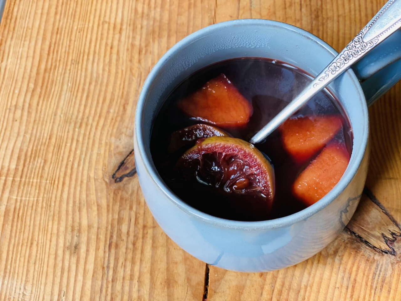 후식으로 마신 뱅쇼. 스틱형 계피가 없어서 아쉬운 대로 가루를 이용했다. 역시 스틱형 나무 계피가 본연의 향을 충분히 낸다. 생강은 만들어 두었던 생강청을 넣었다. 생강청을 넣으니 맵지 않고 부드러웠다. 과일은 사과 반쪽 레몬 한 개. 보통 약간 단맛의 오렌지를 넣는데 없어서 황설탕을 조금 넣었다. 베이스 와인은 부드러운 레드와인을 사용한다. 베이스 와인을 좀 더 좋은 와인을 사용하면 풍미가 더해지지만 가벼운 와인을 사용한다. 더 자세한 뱅쇼 이야기는 지난 브런치를 참고하기 바란다.