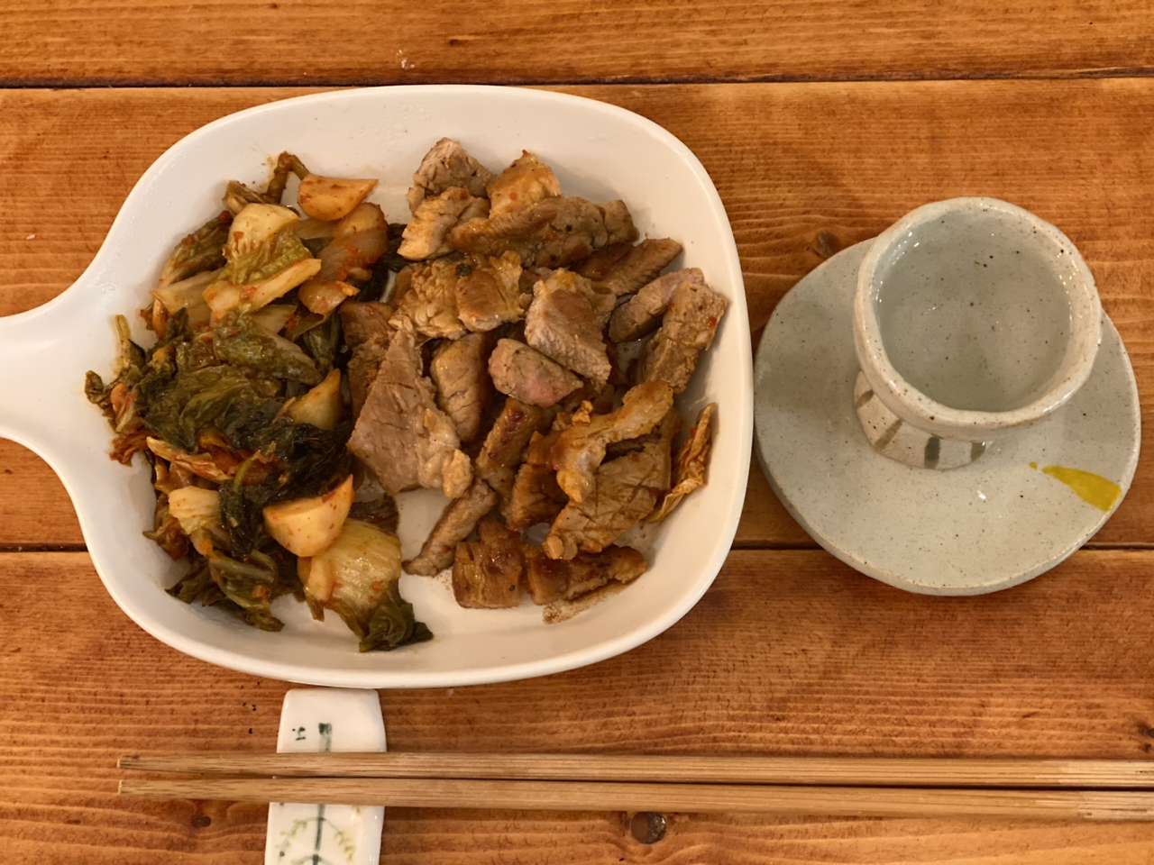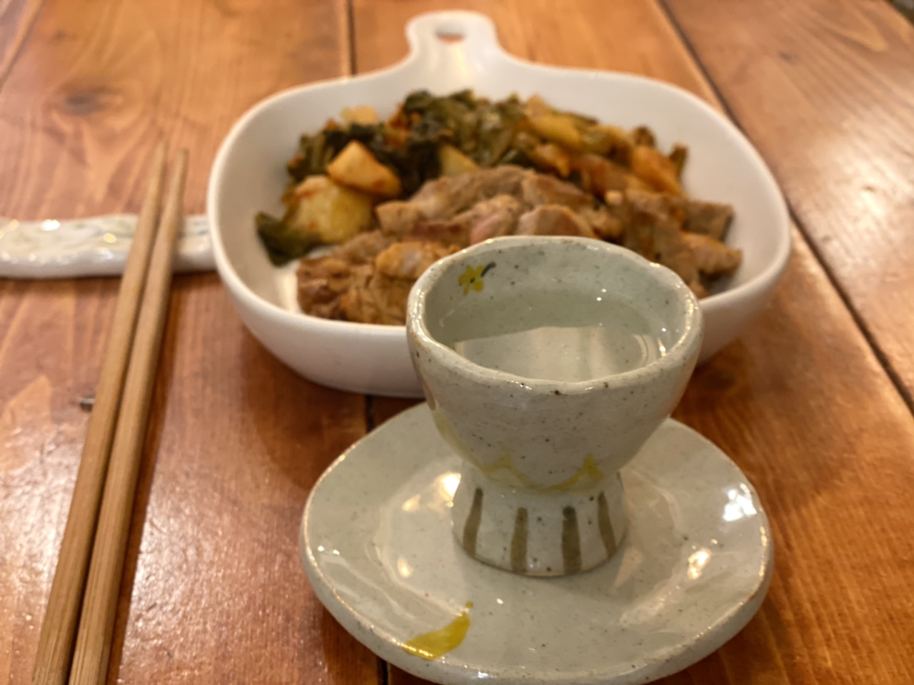 '김치 볶음 목삼겹과 이슬이 한잔'. 오래전 도자기를 배워 구운 술잔에 따르니 맑고 예쁘다. 경종 김치 볶음인데 사진을 보고 있자니 지금도 군침이 돈다. 고기는 후추 소금을 약간만 넣고 굽다가 고기는 주변으로 동그랗고 넓게 물린다. 중앙에 경종 김치를 볶는다. 고기에 김치의 향이 배어 맛있다. 마지막에 고기에만 발사믹 식초를 조금 뿌려준다.