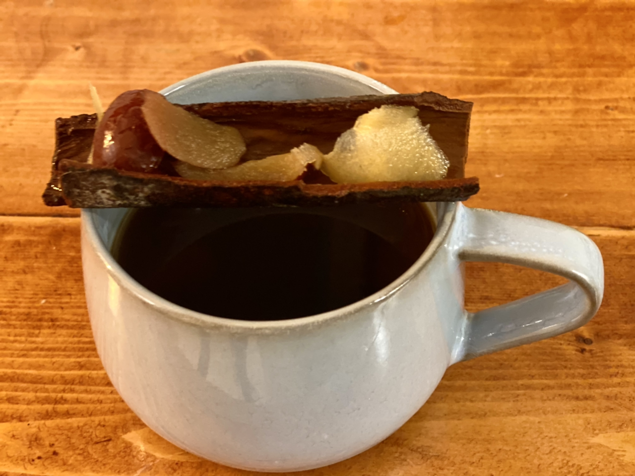 마지막으로 술 좋아하지 않는 이를 위해 따뜻한 대추차 한잔 추가한다. 대추는 따뜻한 물에 씻어야 사이에 낀 먼지가 잘 제거된다. 대추, 생강, 통계피(나무 계피) 그리고 흑설탕 약간이다.