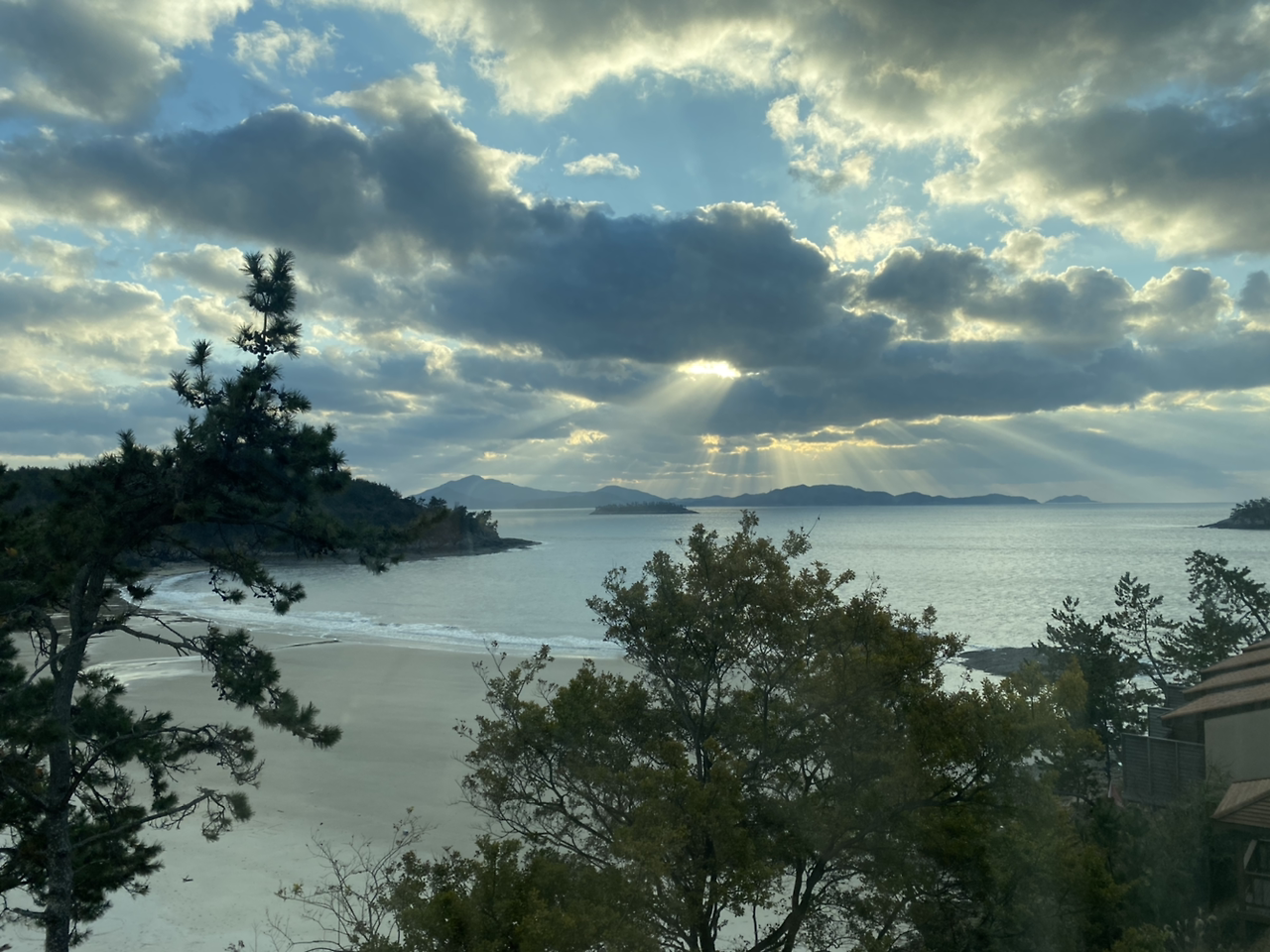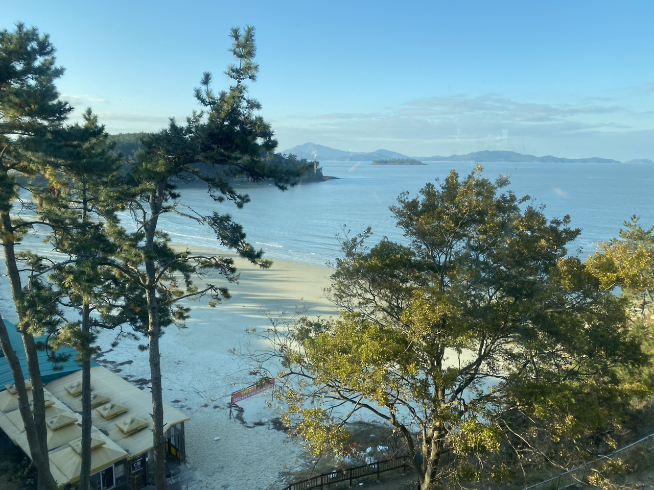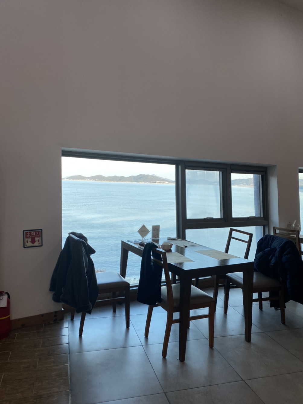 아침 식사하는 곳에서 창밖 바다 풍경이 아름답다.