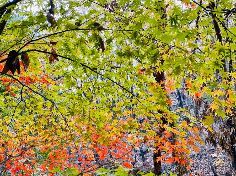 단풍이 많이 들지는 않았지만, 별사탕 모양 단풍나무 하나 발견한다. 우리 모두는 신이 나서 사진을 찍었다. 나이가 들면 사진도 찍기 싫다고 할 때는 언제고 "나도 찍어줘, 나도!" 하면서 모두 앞에 나선다. 나는 모임을 하면 항상 사진사의 역할을 하기 때문이다. "네가 찍으면 예쁘게 나와." 하하호호 우리들의 웃음이 계곡에 퍼진다.