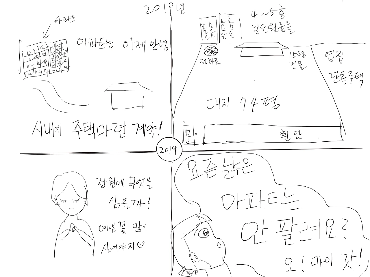도심지에 정원을 가꾸고 싶은 꿈에 시내의 집들을 보러 다녔다. '마당 넓은 집'을 발견하고 덜컥 계약부터 했다. 살던 아파트를 매물로 부동산에 내놓았다. 그런데 문제가 생겼다. 아파트 시세가 현저히 떨어졌고 매수자가 줄었다. 모두들 신축 아파트로 몰리게 된 것이다.