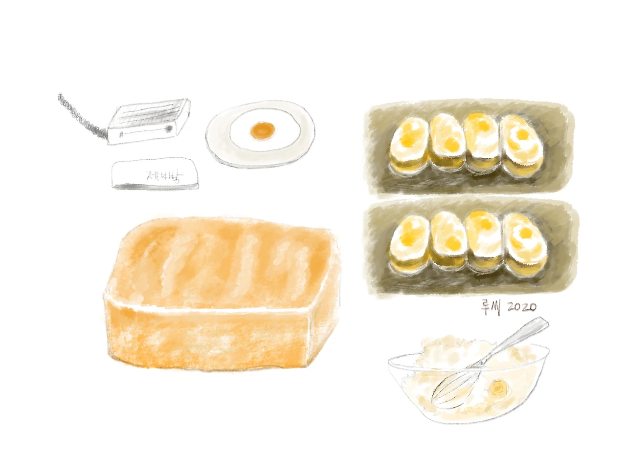 나의 아버지는 새로운 주방도구 애착이 크셔서 사서 해 보시는 것을 즐기셨다. 중학생이 된 어느 날, 아버지께서 가정용 빵 만드는 전기스토브 같은 형태의 기계를 구입하셨다. 아주 작은 직사각형 모양이었다. 아버지께서 빵을 만드실 때면, 가루를 측량해서 반죽을 버무리는 등의 작은 행복은 우리 몫이었다. 빵이 완성되어 뚜껑을 열었을 때, 구수하고 포근한 내음의 달걀빵 향기가 집안을 가득 메웠다. 우리 여덟 식구는 순식간에 빵을 다 먹어치웠다. 사실 그때 우리들은 무엇을 먹어도 다 맛있었다. 얼른 집지 않으면 없어지니까. 먹는 경쟁이라고 해야 할 정도였다. 물론 그 전에는 할머니께서 막걸리를 넣어 부풀린 술빵 같은 것을 만들어 주셨지만, 제빵기의 매력에 우리는 모두 홀딱 빠지고 말아 한동안 빵을 해 먹었다.